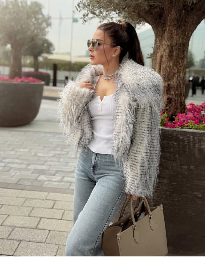 قدّمت مي عمر قراءة مختلفة للفرو، بعيدة عن المبالغة، قريبة من النقاء. اختارت جاكيت فرو بيضاء أنيقة، نسّقتها مع فستان أبيض قصير، وأكملت الإطلالة بحقيبة وحذاء باللون نفسه.