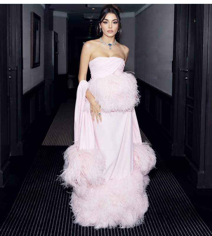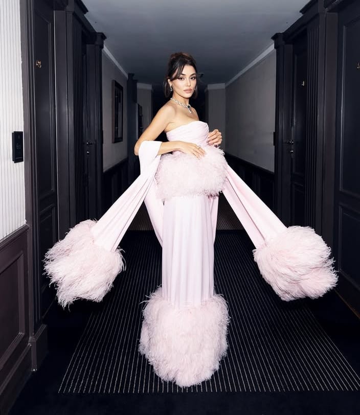 اختارت هاندا أرتشيل الفرو بأسلوب درامي يفيض فخامة وتميّزًا، في إطلالة لافتة على السجادة الحمراء. أطلت بثوب طويل باللون الزهري الفاهي، تناثر الفرو من أسفله ومن الوشاح الطويل الذي انسدل على جسدها بنعومة شاعرية.