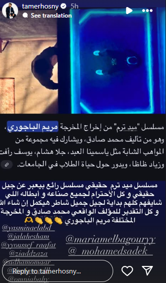 أعرب الفنان تامر حسني عن إعجابه الشديد بمسلسل "ميد ترم"، الذي يعد أولى البطولات الدرامية المطلقة للفنانة الشابة ياسمينا العبد. ووصف حسني العمل بأنه تجربة فنية رائدة تنجح في نقل تفاصيل وحياة جيل الشباب الحالي بصدق وواقعية، مشيداً بالرؤية الفنية التي قدمها القائمون على المسلسل.