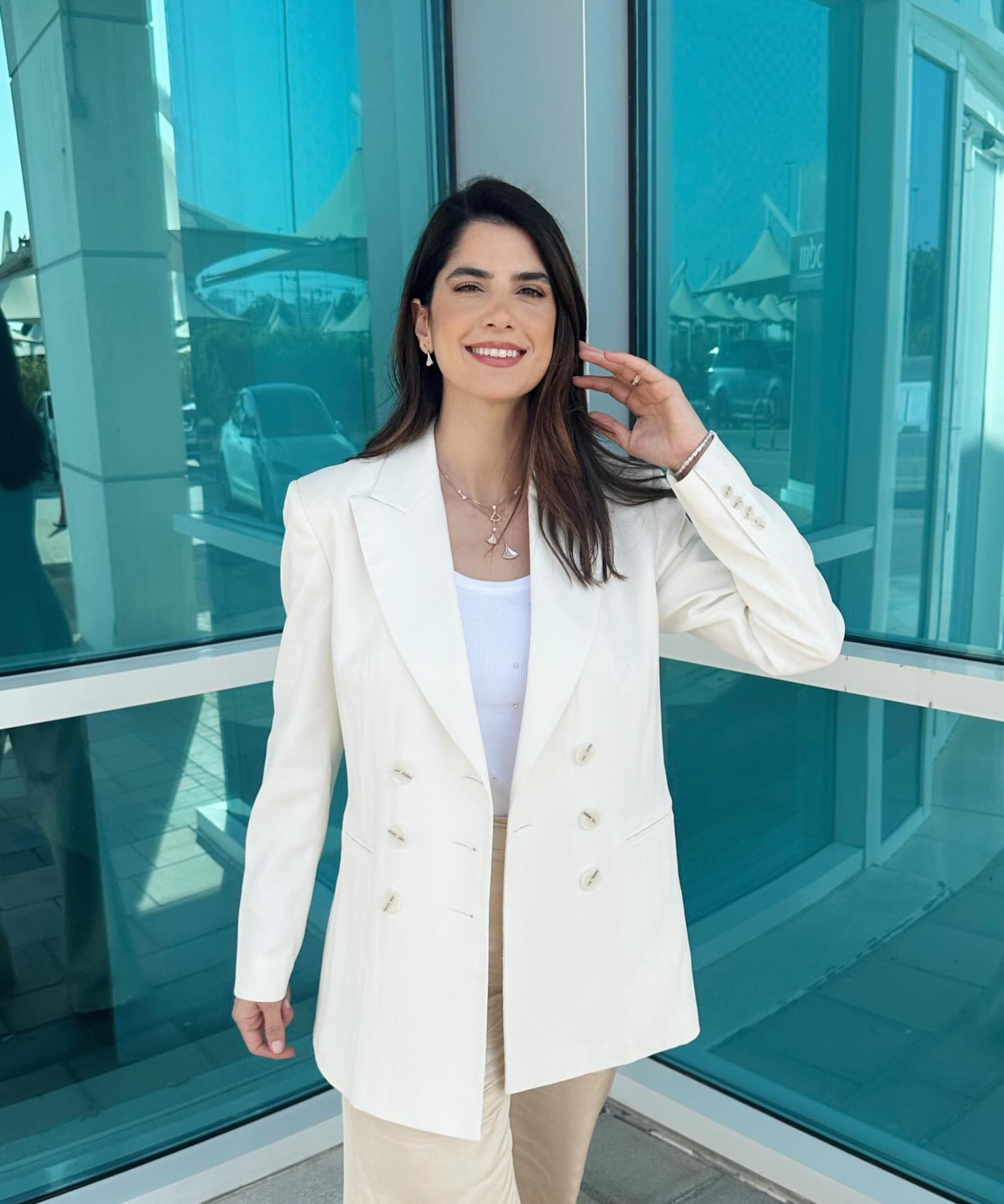 مع أول ظهور ترويجي رسمي للمسلسل، اختارت كارمن إطلالة تجمع بين الهدوء والعصرية. ارتدت بلايزر أبيض Oversized بتصميم كلاسيكي واسع، نسقته مع بنطلون بيج فاتح بخصر عالٍ وتوب أبيض بسيط، مانحةً إطلالة تمزج بين القوة والأنوثة.