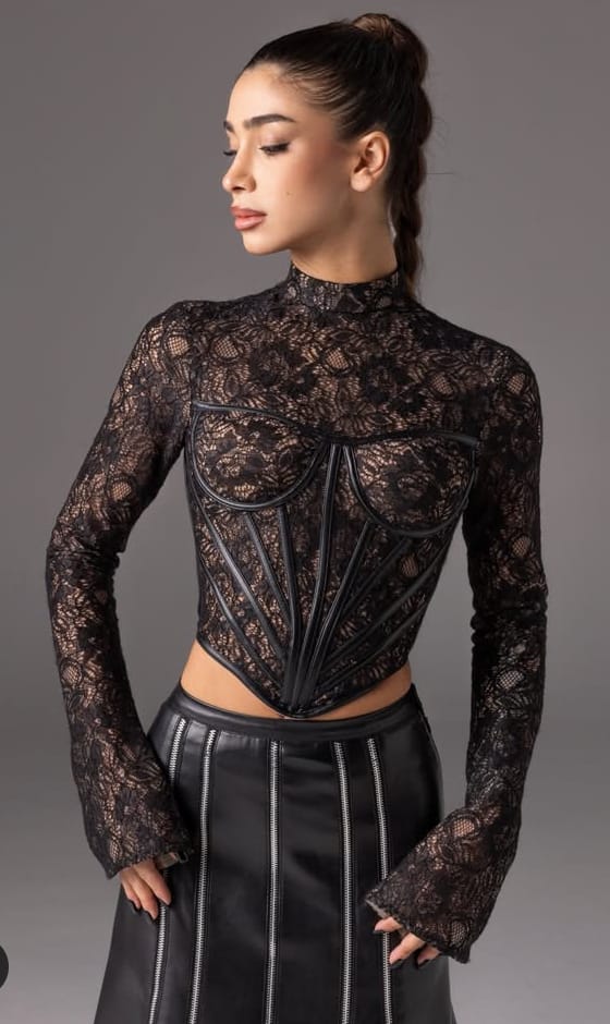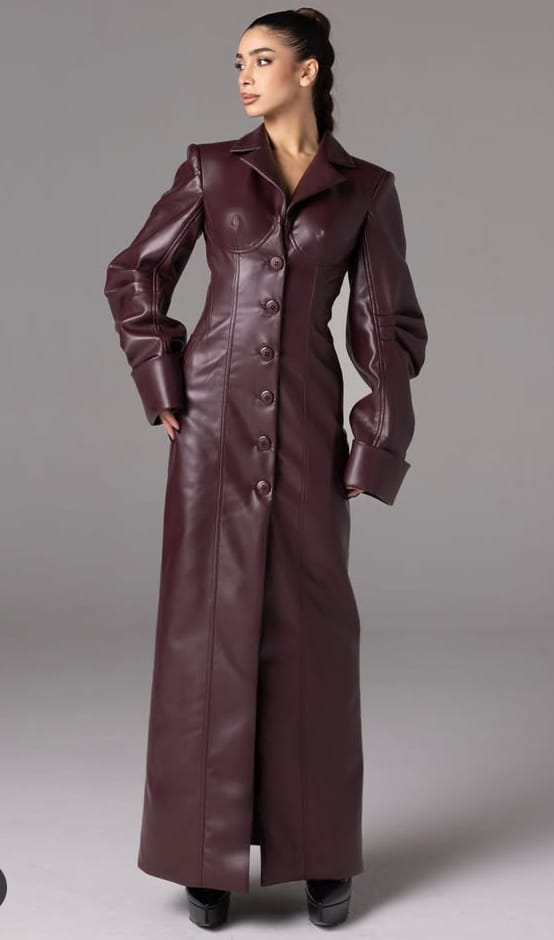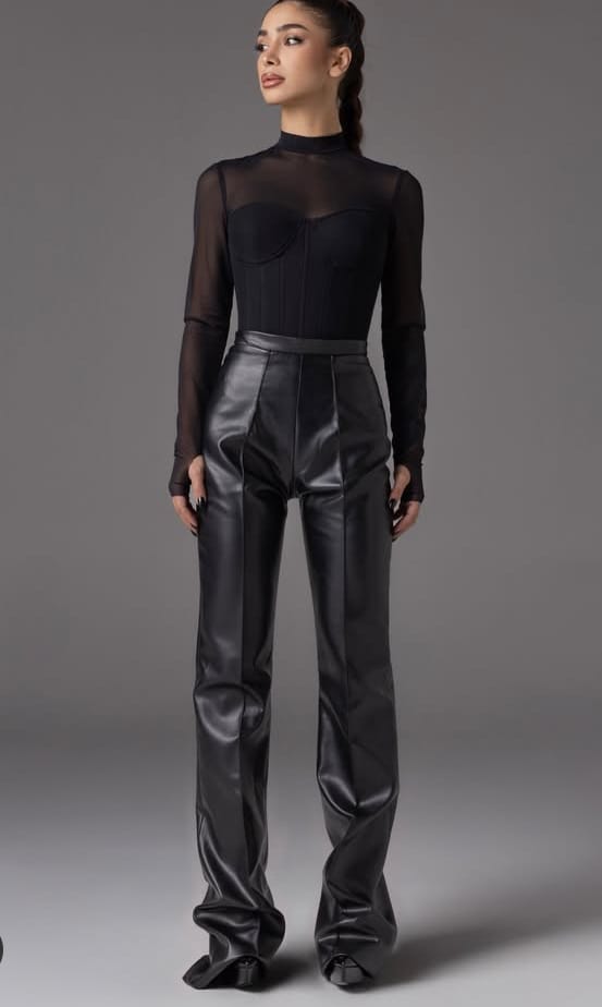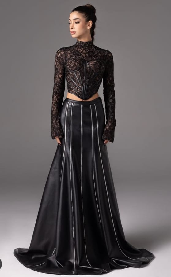 الجلد كان سيد القماش الأوّلي للمجموعة، لا كعنصر زخرفي، بل كمادة بنيوية أساسية. معاطف جلدية طويلة تلامس الأرض، محاذية للجسم، ترسم القوام بخطوط صارمة. سراويل بخصر عالٍ وأرجل واسعة، تمنح التوازن بين الحدة والراحة. توبات شفافة، وبوديّات، وكورسيات، وصدريات تشدّ الجذع وتبرز البنية الهندسية للتصاميم.