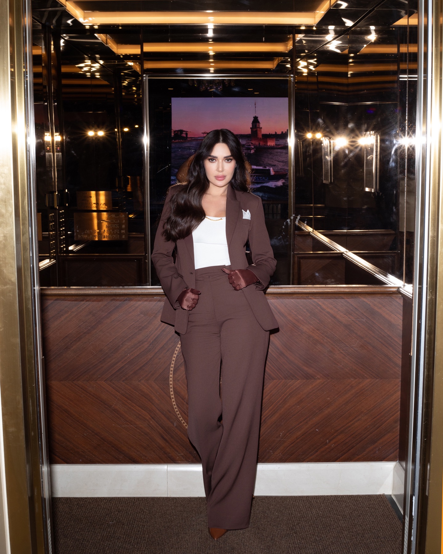 بدورها، تألقت درة زروق ببذلة بنية دافئة من توقيع دار Fendi، تميّزت بياقة ساتان لامعة وتصميم يمزج بين الكلاسيكية والستريت ستايل الفاخر. نسّقت درة الإطلالة مع توب وحقيبة باللون نفسه، لتحقق مظهرًا مونوكروميًا متناغمًا وآسرًا. وتبقى الألوان الترابية، كالبني والجملي، خيارًا مثاليًا لإطلالات شتوية دافئة، خصوصًا عند تنسيقها ضمن تدرجات لونية متقاربة في المناسبات الرسمية.
