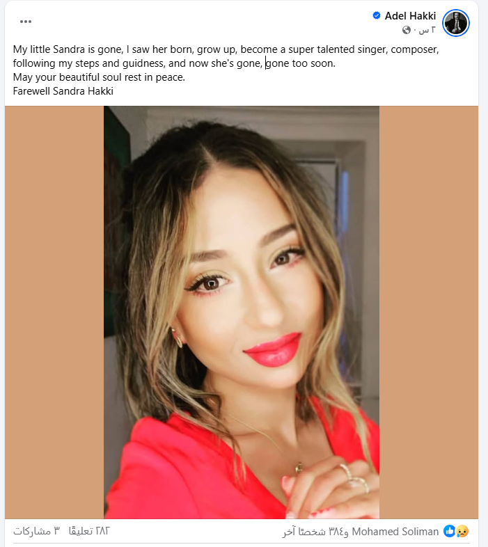 "رحلت ابنتي الصغيرة ساندرا، رأيتها تولد وتكبر وتصبح مغنية وملحنة موهوبة للغاية، تسير على خطاي وبتوجيهي، والآن رحلت، رحلت مبكرًا جدًا. رحم الله روحك الجميلة وأسكنها فسيح جناته. وداعًا ساندرا حقي."