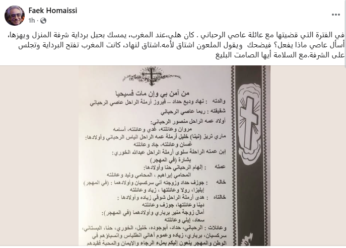 بكلمات تفيض حنيناً، ودّع الممثل فائق حميصي الراحل هلي الرحباني، نجل السيدة فيروز، مسترجعاً قصة إنسانية لم تُحكَ من قبل. ونشر حميصي ورقة النعوة واصفاً الراحل بـ "الصامت البليغ".