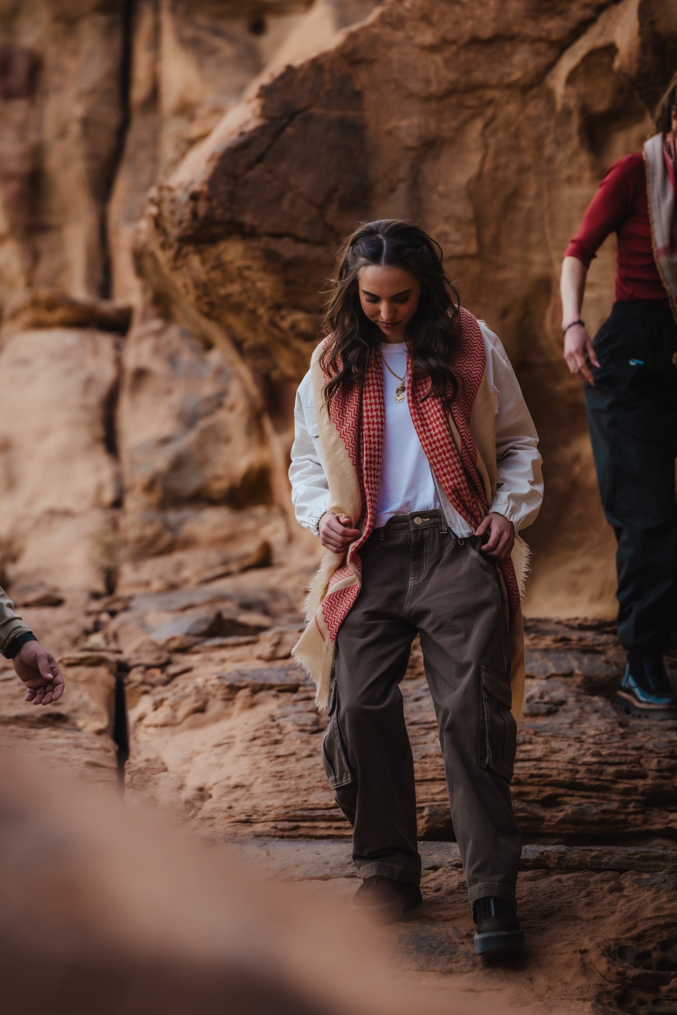 اختارت الملكة سروال «كارغو» باللون الأسود مع كنزة باللون الأحمر البرغندي الدافئ، في تناغم لافت مع ألوان الصحراء، ونسّقت الإطلالة مع حذاء «رينجر» عملي يواكب تضاريس الوادي، فيما رفعت شعرها ببساطة بنمط ذيل الحصان. أما الكوفية الأردنية التي زيّنت عنقها، فكانت أكثر من إكسسوار؛ كانت علامة انتماء وفخر، وبوصلة هوية لا تغيب عن إطلالاتها.