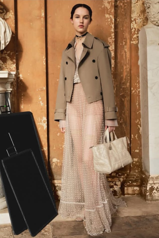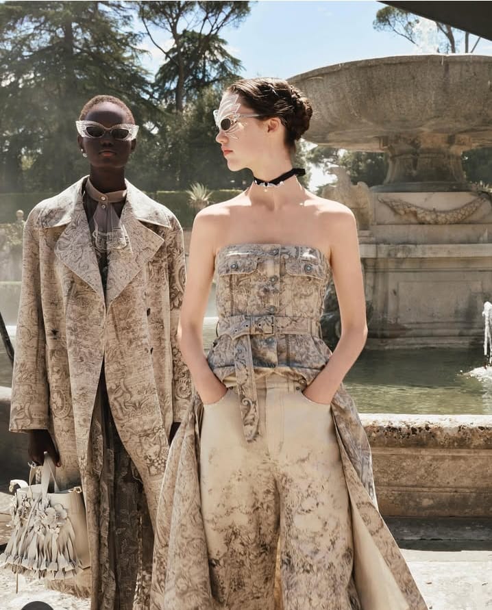 لم تكتفِ دار ديور بتصميم فساتين باللون البيج، بل ذهبت أبعد من ذلك، فحوّلته إلى هوية متكاملة. قدّمت حقائب تُعدّ من الأجمل بهذا اللون، مع تدرجات فاتحة تكاد تلامس الأبيض، وأخرى مغبرّة تنضح بالنعومة. كما برز البيج في جاكيتات جلدية، ومعاطف أنيقة، وفساتين شفافة ذات طبعات خفيفة، حملت روح الدار الهادئة والشفافة، وجعلت من هذا اللون مرادفًا للفخامة الرقيقة.