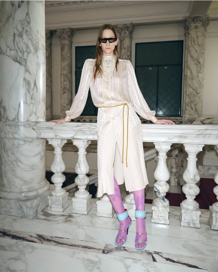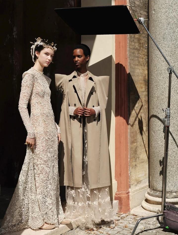لدى فالنتينو، جاء اللون البيج أشبه بالحلم. فساتين ناعمة، قصّات عالية الرقي، وإبداع في مزجه مع ألوان أخرى كالزيتي والموف. صياغة أنثوية شفافة، حملت توقيع الدار الرومانسي، وقدّمت البيج بلغة شاعرية تفيض بالرقة والترف، بعيدًا عن أي صرامة.