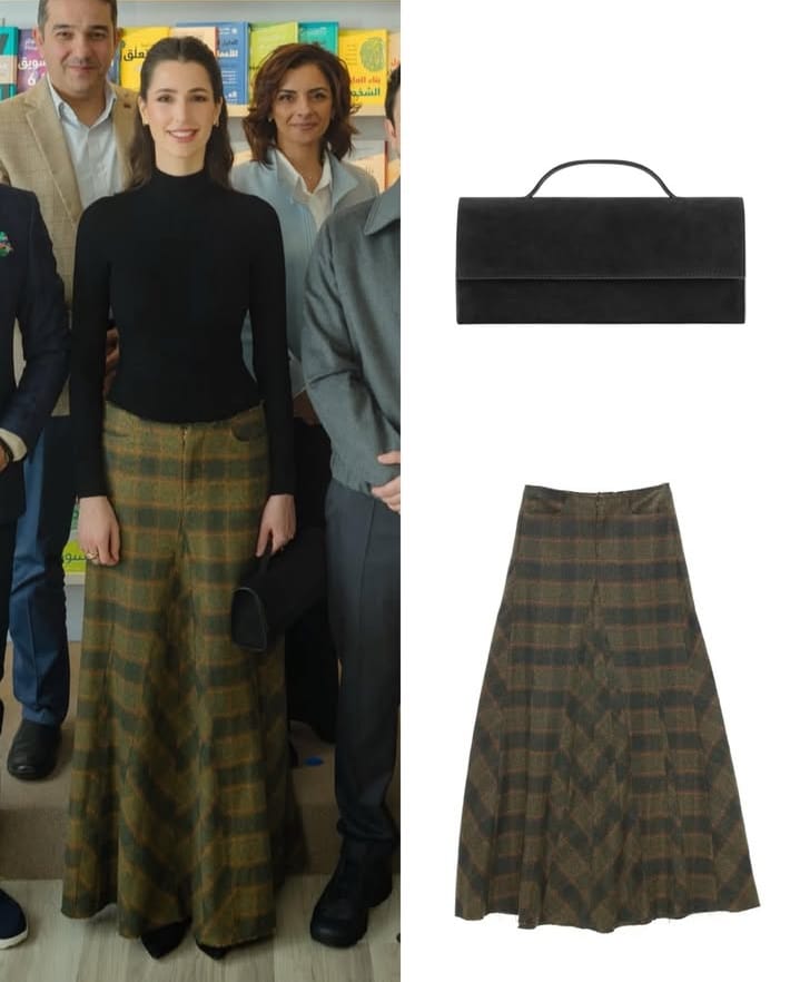 اختارت الأميرة رجوة تنورة طويلة بنقشة الكاروهات باللونين الأخضر والخردلي، بقصة كلوش متوسطة وقماش شتوي يمنح الإطلالة إحساسًا دافئًا ينسجم مع أجواء الموسم.