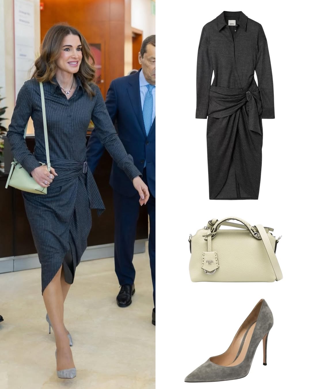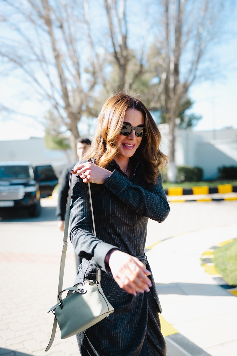 نسّقت الملكة إطلالتها مع حقيبة يد من طراز By The Way من دار Fendi، أضافت لمسة فاخرة ناعمة، إلى جانب حذاء مدبّب من علامة Gianvito Rossi مصنوع من الجلد المدبوغ باللون الرمادي الدخاني، سبق أن اعتمدته في إطلالات سابقة، تأكيدًا على ذوق عملي ذكي يعيد توظيف القطع الأيقونية.