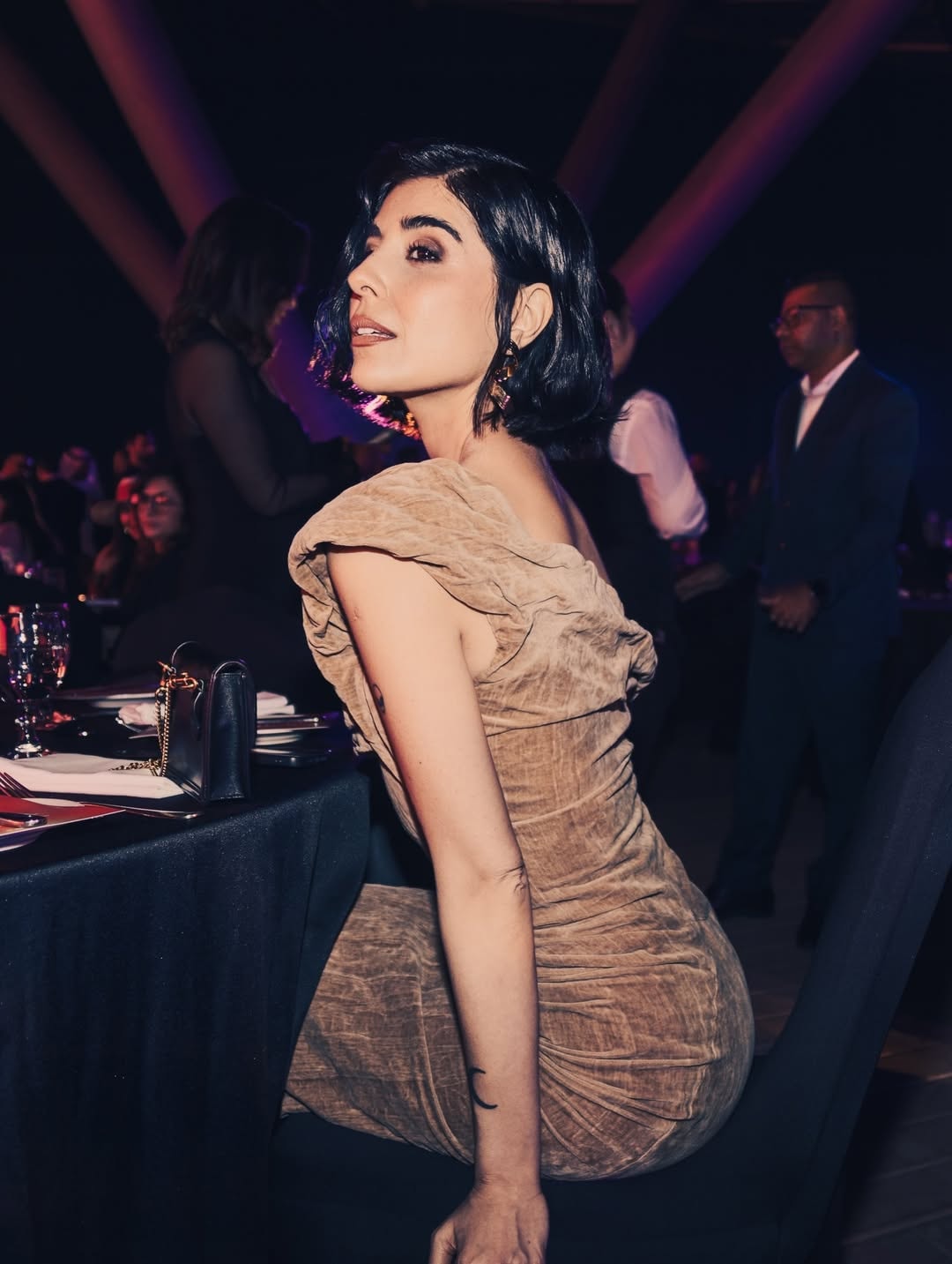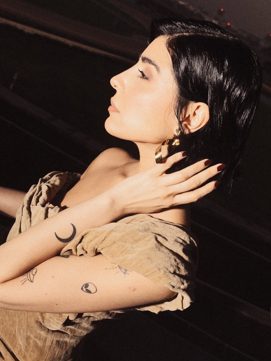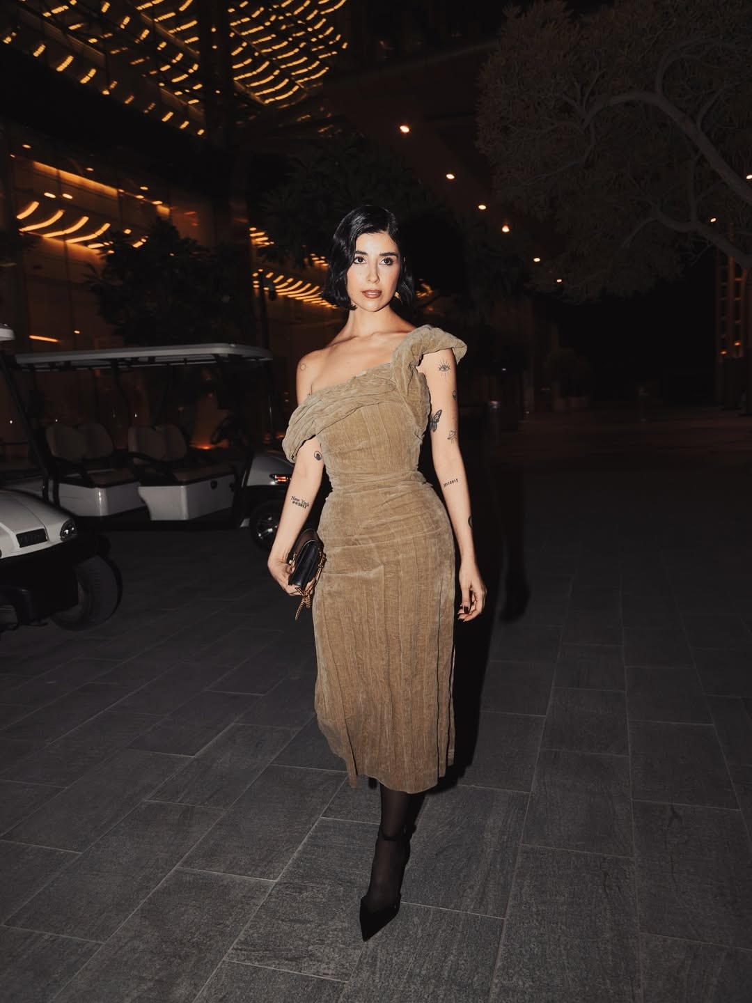 اختارت زينة أن تترك صفحة الصدر خالية من أي عقد أو إكسسوار تقليدي، وكأنها تعلن اكتفاءها بذاتها. وحده جلدها كان الحلية، مزدانًا بتاتو متفرّق يحمل رموزًا بصرية: عين، قمر، جمجمة… عناصر تبدو كقصاصات من عالمها الداخلي، تُكمل الإطلالة وتمنحها عمقًا شخصيًا بعيدًا عن الزينة الجاهزة.