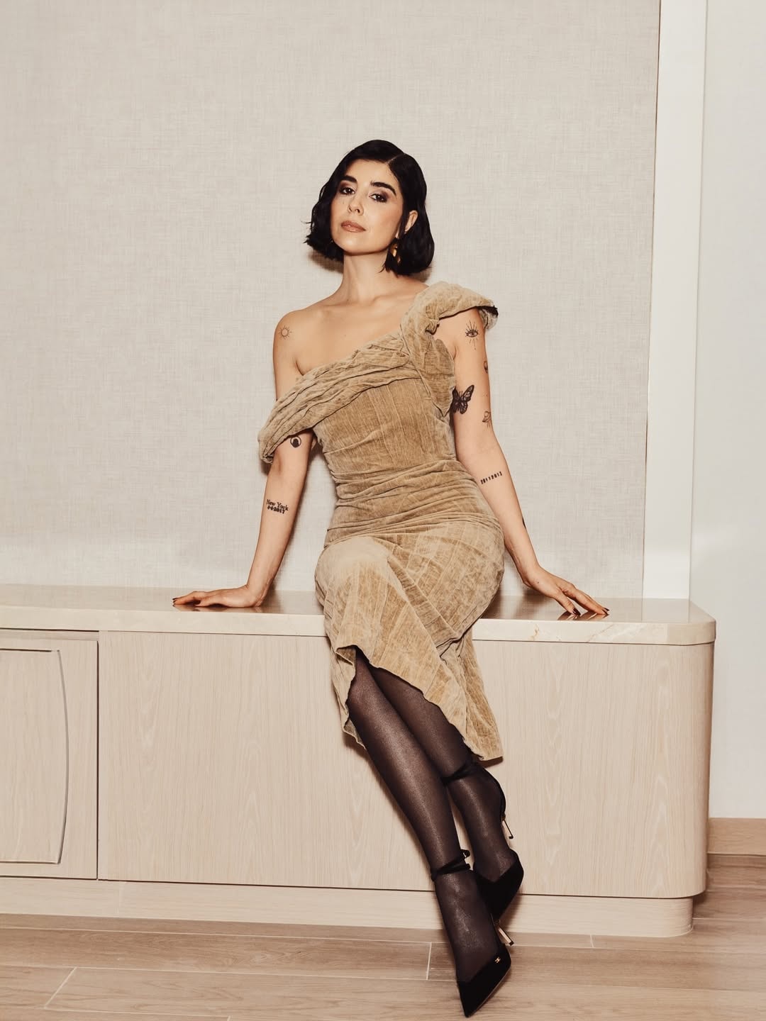 في هذه الإطلالة، اختارت مكي ثوبًا مخمليًا متوسط الطول باللون البيج الرائج من توقيع Tory Burch، لون حيادي يعكس نضجًا بصريًا ويمنح الإطلالة سكونًا أنيقًا. الثوب بقصة كتف واحد، بسيطة في ظاهرها، لكنها غنية في تفاصيلها، تترك مساحة للحضور أن يتقدّم دون ضجيج.