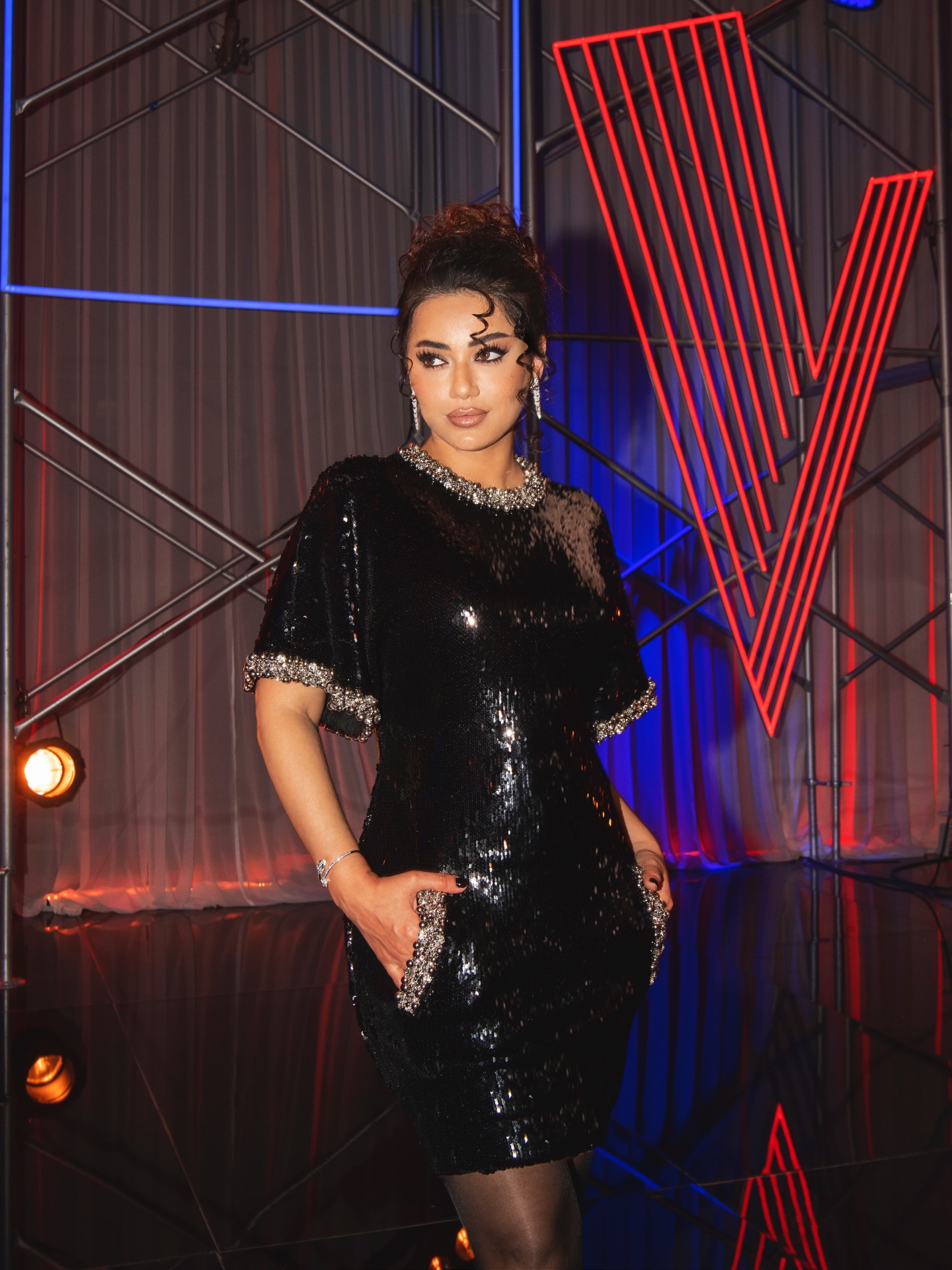 ختمت رحمة رياض النصف النهائي من برنامج ذا فويس بإطلالة درامية خطفت الأنظار، لتؤكد مرة جديدة على كونها أيقونة للأناقة والذوق الرفيع على المسرح. النجمة التي تألقت منذ الحلقة الأولى بذكاء في اختيار إطلالاتها، والتي كان يقف وراء تنسيقها خبير الموضة سيدريك حداد، وضعت مسك الختام بثوب قصير من توقيع المصمم اللبناني العالمي زهير مراد، مرصع بموج البريق المتناثر على حواف الأكمام القصيرة وعند العنق وجوانب الثوب، ليضفي على الإطلالة طابعاً حيوياً ومشرقاً.
