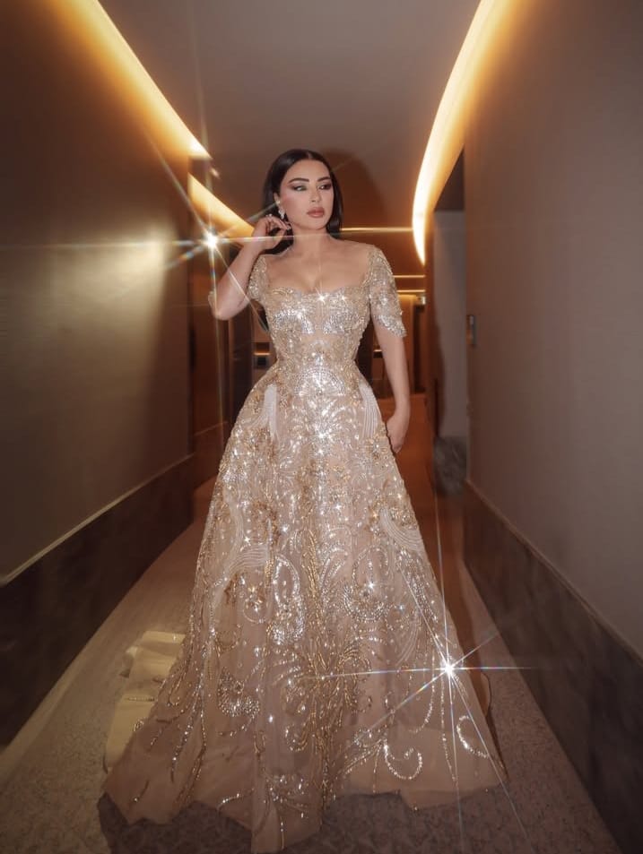 سلافة معمار تألّقت بثوب ذهبي من توقيع إيلي صعب، منحوت على الجسم بخامة بيج شفافة، مغطاة برسومات ذهبية وفضية تكسو الثوب بالكامل. التصميم المكمم والمرصّع بالحركة عكس توازنًا بين الرقي والجرأة، وجعل الذهبي يبدو حيًا، ينبض مع كل خطوة.