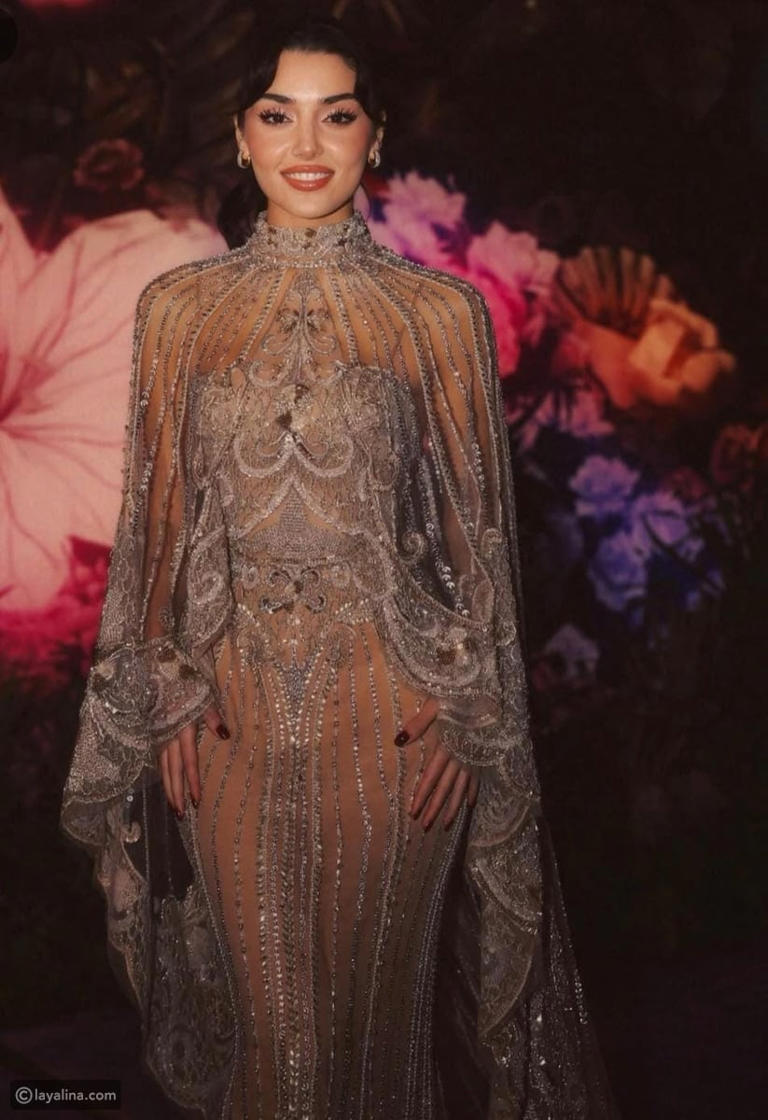اختارت ياسمينا زيتون ثوبًا منحوتًا من توقيع نيكولا جبران، موشى ومرصّع بالأحجار اللامعة، بدا كأنه سبيكة ذهبية مصقولة. تصميم طويل يمسك الجسد بدقة، مع أرداف دائرية تلامس الأرض وتضفي فخامة درامية. واكتملت الإطلالة بحلي راقية من شوبارد عززت الطابع الملكي للّون.