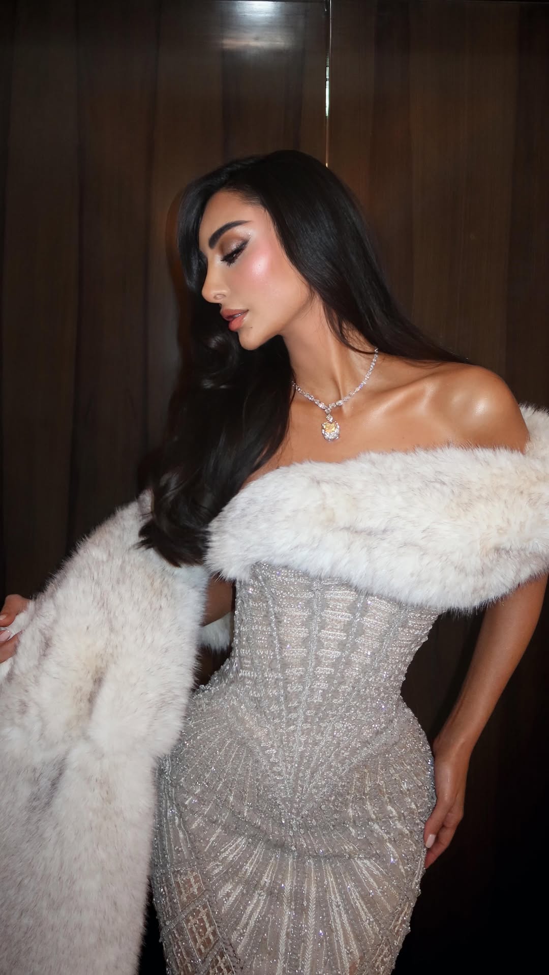 تألّقت كارن وازن، المؤثرة على السوشيل ميديا، بثوب أبيض يشبه نسج خلايا النحل، مسك الجسم بانسيابية، ومنقوش بالكريستال الفضي البراق من تصميم إيلي صعب. الإطلالة جمعت بين التقنية الدقيقة واللمعان الساحر، فبدت كارن كأنها تجسد النقاء الحديث والفخامة الهادئة في آن واحد.