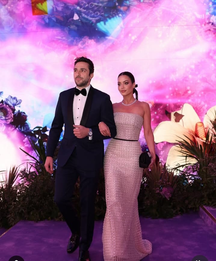 مي عمر أطلت بثوب أبيض يحمل الطابع الملكي والهش. التصميم من سارة مراد، مزين بالخرز والأحجار بخطوط شبه دائرية، مع قطار طويل ينسدل بانسيابية، يمسك الجسم بحزم دون التضحية بالراحة أو الحرية في الحركة. الإطلالة أكدت أن الأبيض قادر على الجمع بين النعومة والهيبة في خطوة واحدة.