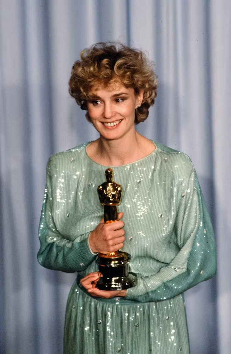 عندما نالت جيسيكا لانج أول جائزة أوسكار لها عن Tootsie، اختارت فستان فالنتينو باللون الأخضر النعناعي المرصّع بالترتر، في لحظة جسّدت بداية علاقة الدار مع السجادة الحمراء كمساحة للخلود