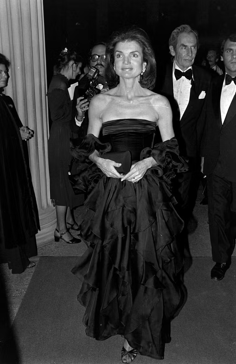 شكّلت جاكلين كينيدي إحدى أولى أيقونات فالنتينو. بثوبها الأسود البسيط ظاهريًا والغني في تفاصيله، مع الوشاح المعقود بطريقة غير مألوفة، رسم المصمم ملامح أناقة سياسية-ملكية تجاوزت الموضة لتصبح مرجعًا بصريًا خالدًا