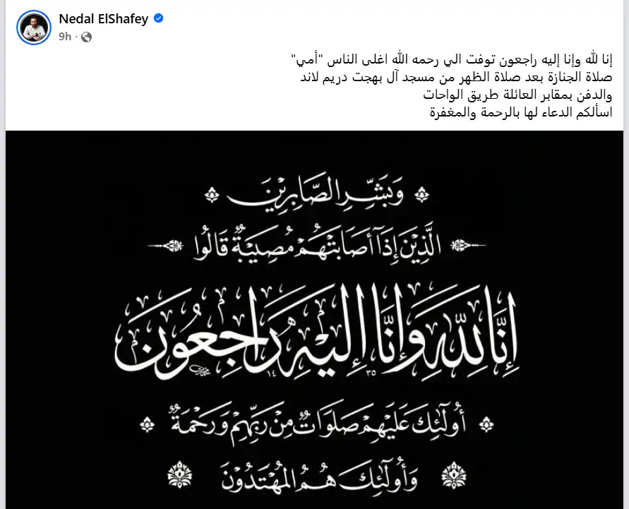 أعلن نضال الشافعي خبر وفاة والدته عبر حسابه الرسمي على منصة "فيسبوك"، حيث نعاها بكلمات مؤثرة، كاشفًا تفاصيل تشييع الجثمان. وأوضح أن صلاة الجنازة ستُقام عقب صلاة الظهر من مسجد آل بهجت بمدينة دريم لاند، على أن يتم الدفن في مقابر العائلة بطريق الواحات، مطالبًا جمهوره ومحبيه بالدعاء لوالدته بالرحمة والمغفرة.