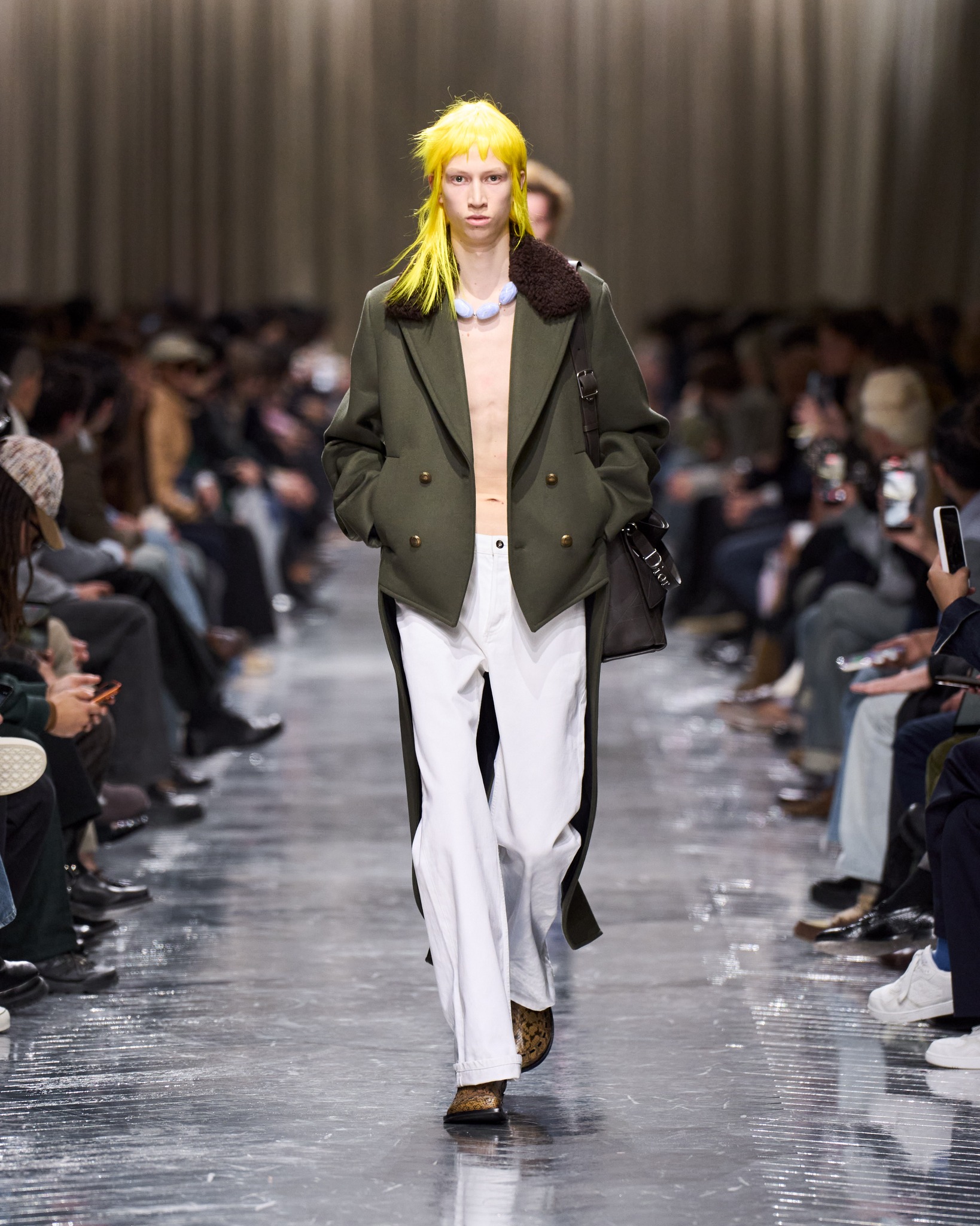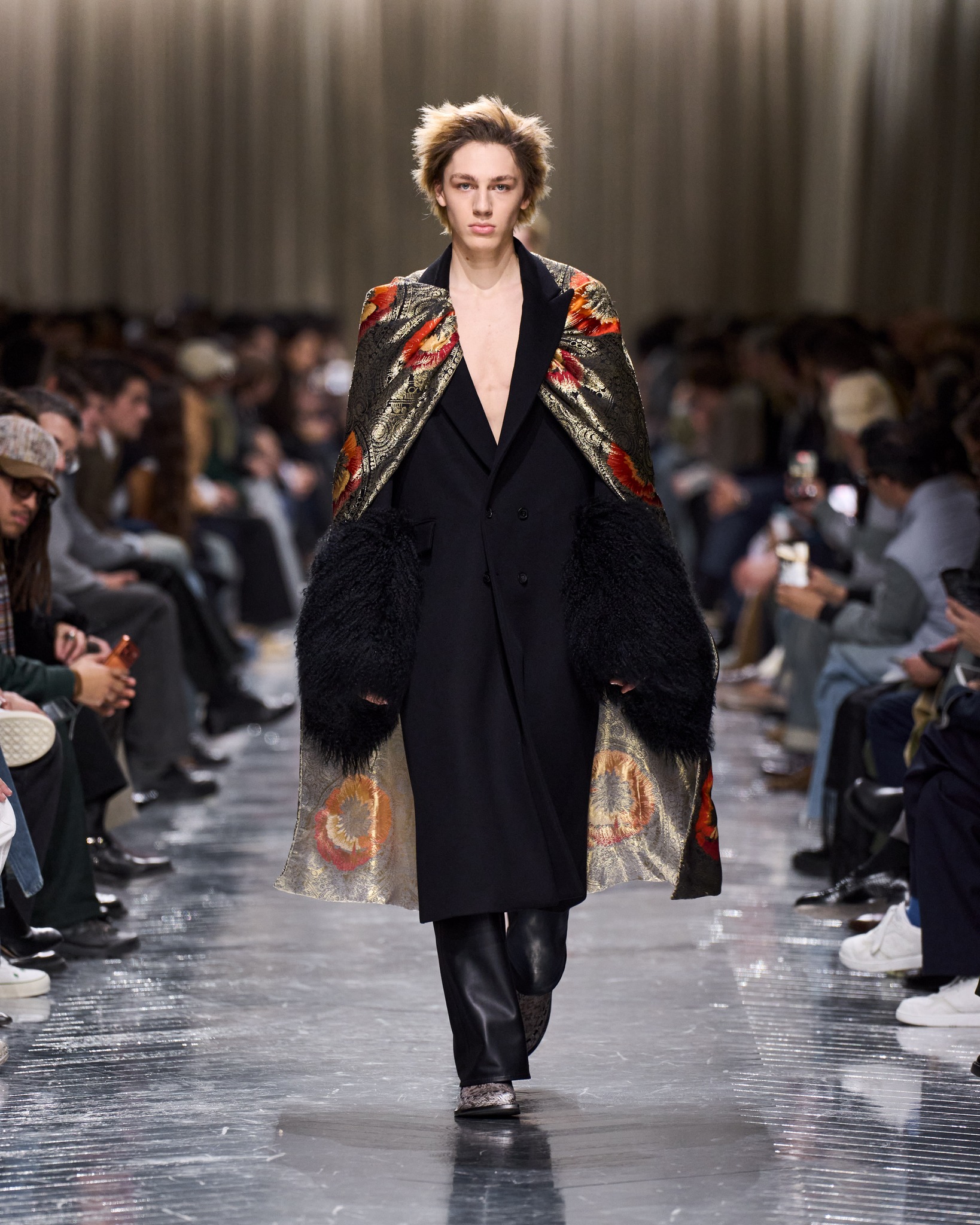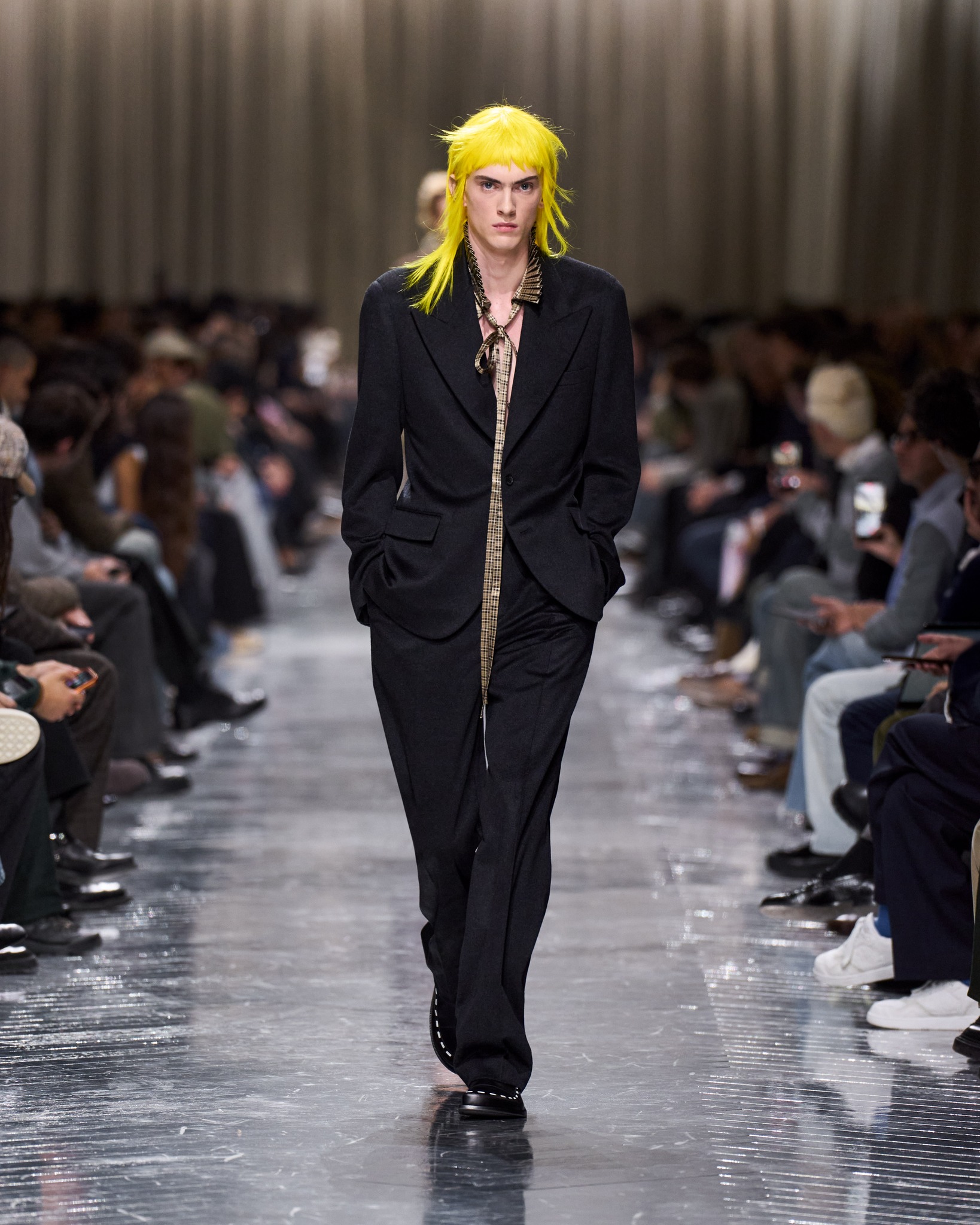 رجال مع الفرو، رجال مع الإكسسوارات، رجال بقصّات أنثوية وشعر أشقر لامع. صورة رجل لا يخشى الظهور في منطقة رمادية، بين ما اعتدناه وما لم نجرؤ على تسميته بعد. ومع ذلك، يترك أندرسون انزلاقاً خفيفاً نحو الكلاسيكية المعهودة، وكأنّه لا يريد قلب الطاولة دفعة واحدة، بل يترك أثراً من الماضي ليذكّرنا بأن للرجل تاريخاً مع الأزياء… تاريخاً يُعاد اليوم تفكيكه لا إنكاره.