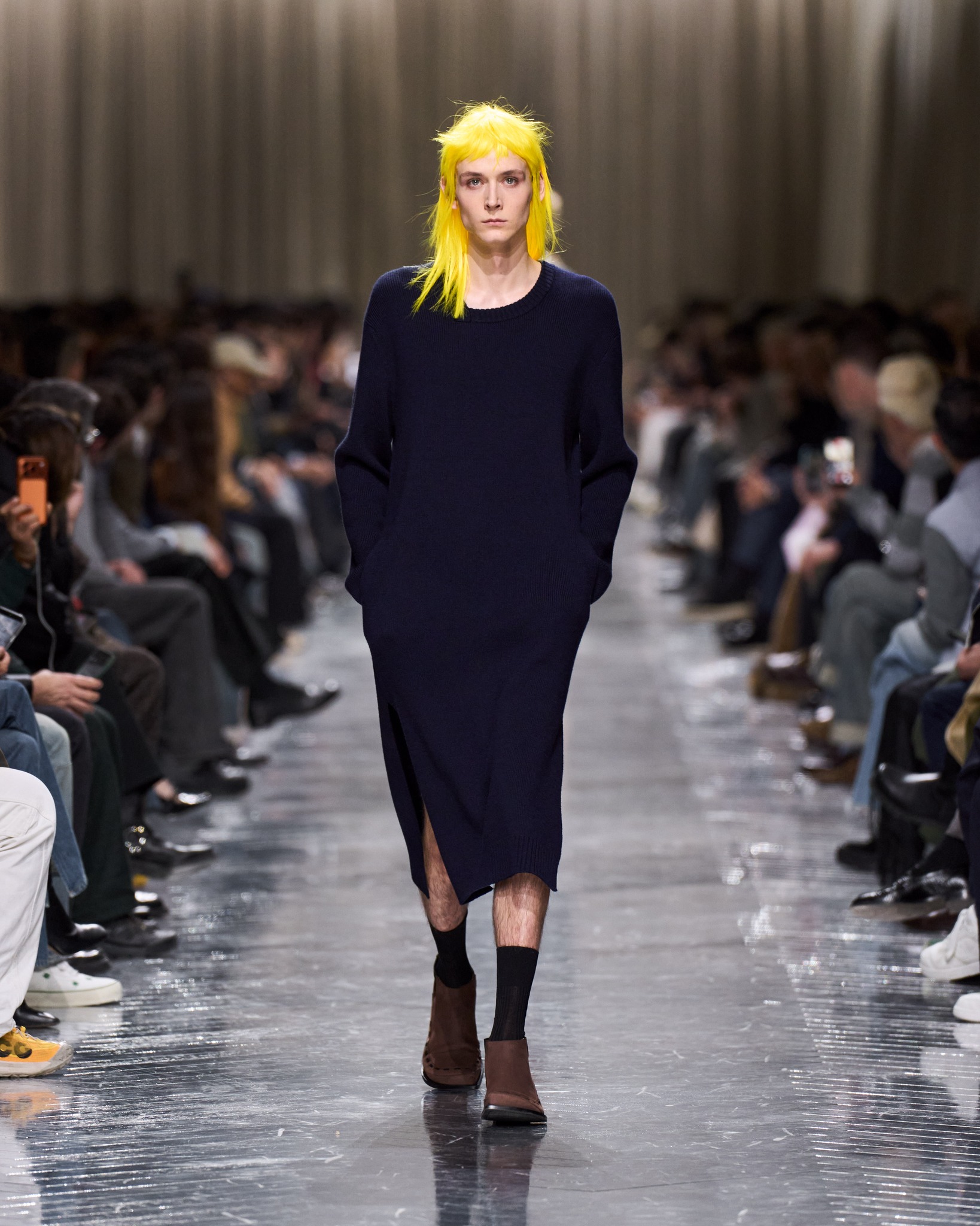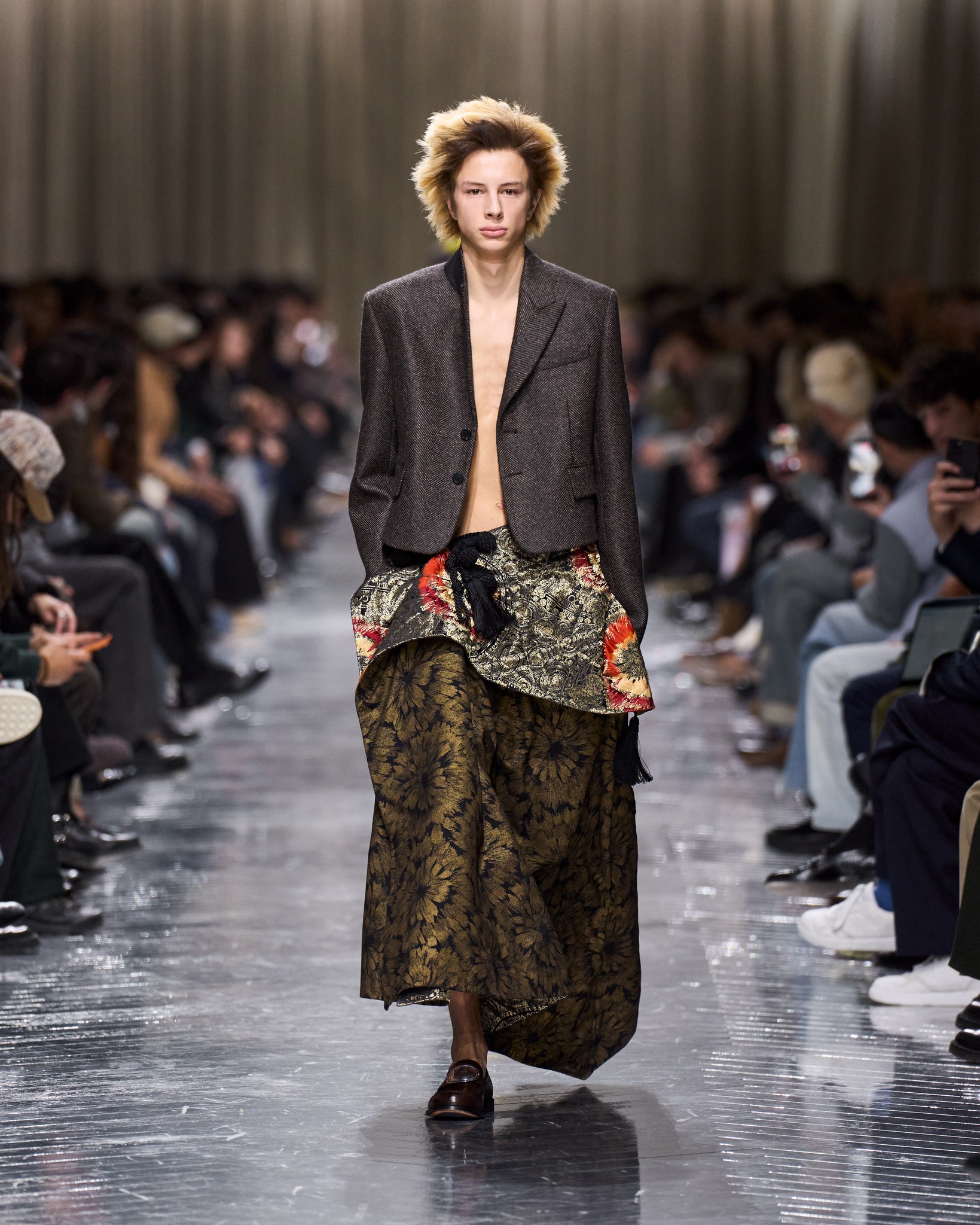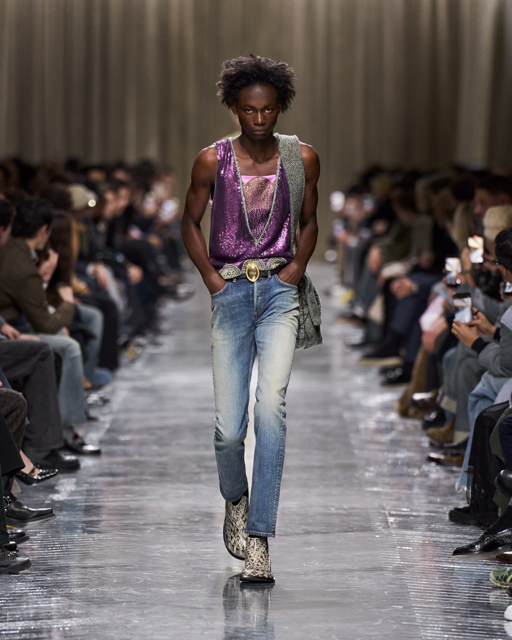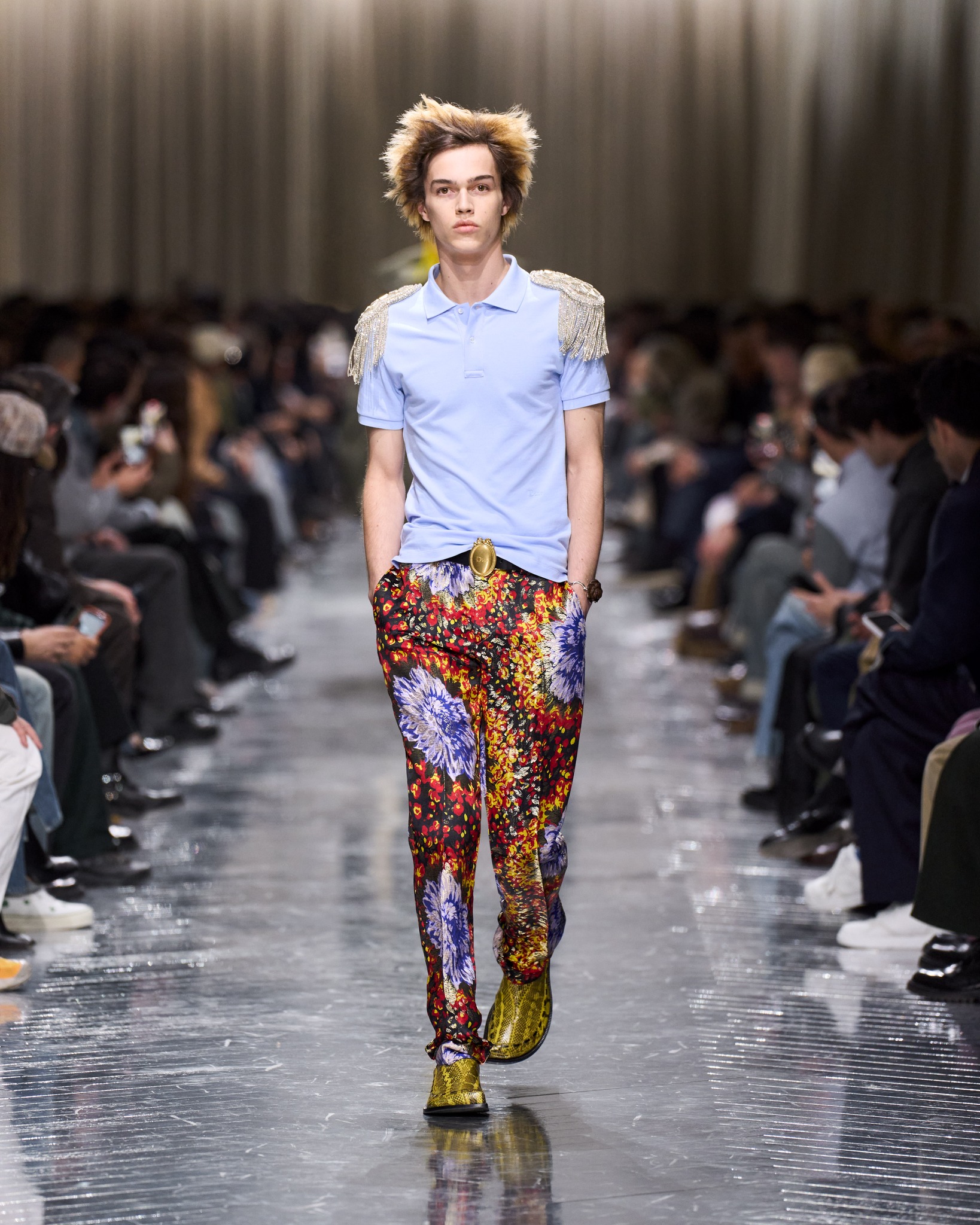 رجال مع الفرو، رجال مع الإكسسوارات، رجال بقصّات أنثوية وشعر أشقر لامع. صورة رجل لا يخشى الظهور في منطقة رمادية، بين ما اعتدناه وما لم نجرؤ على تسميته بعد. ومع ذلك، يترك أندرسون انزلاقاً خفيفاً نحو الكلاسيكية المعهودة، وكأنّه لا يريد قلب الطاولة دفعة واحدة، بل يترك أثراً من الماضي ليذكّرنا بأن للرجل تاريخاً مع الأزياء… تاريخاً يُعاد اليوم تفكيكه لا إنكاره.