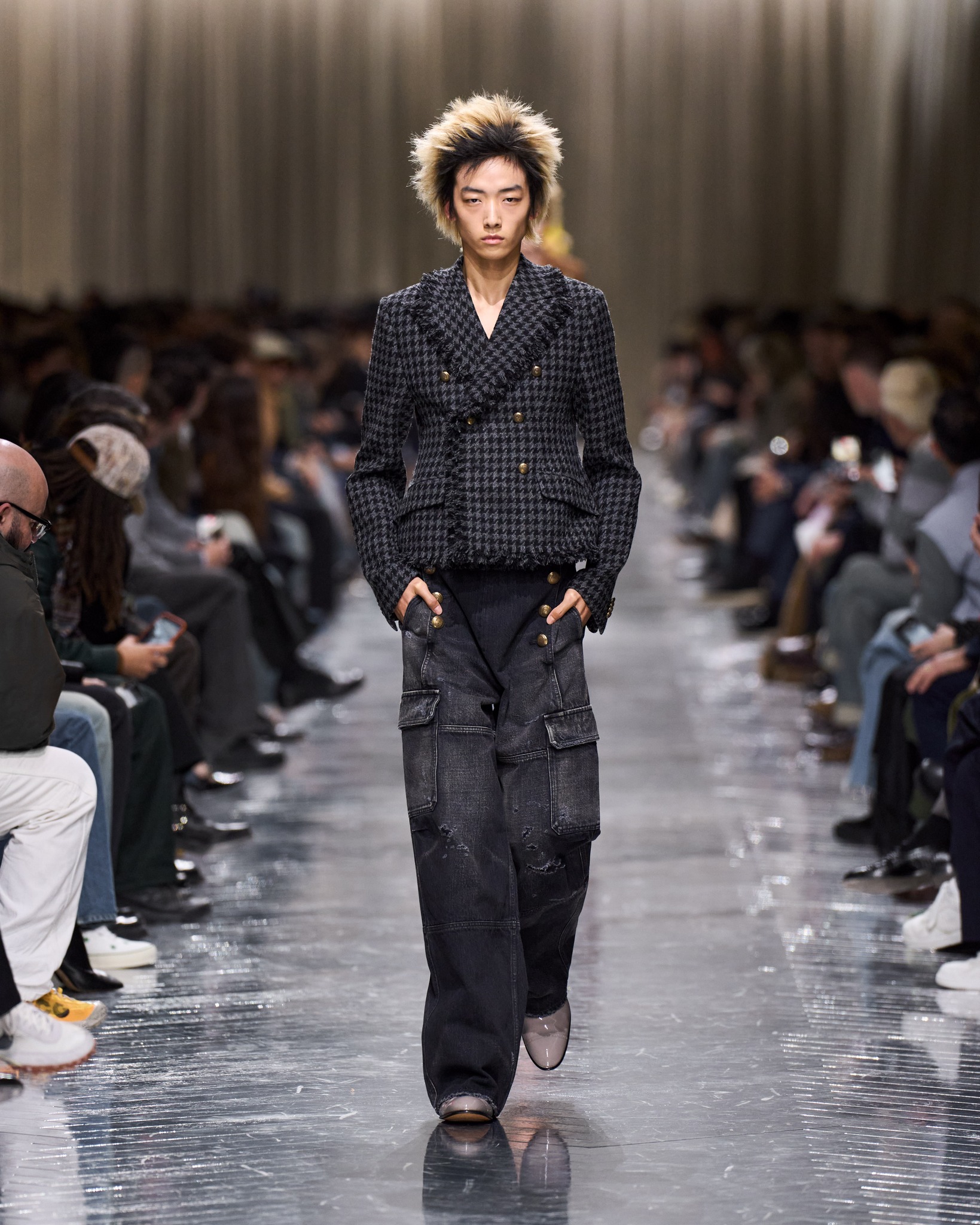 قمصان وـtops من بريق الجينز، مهترئة الحواف، ضيّقة ومقصودة. سترات أشبه بالبردعة، لا تحتفي بالجسد بل تقيّده بصرياً. هنا، لا وظيفة واضحة للقطعة، بل حالة. ديور لا يقدّم ملابس بقدر ما يقدّم أسئلة معلّقة على الأكتاف.