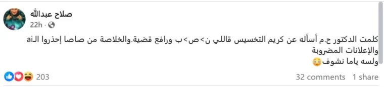 ودعا صلاح عبد الله متابعيه إلى توخي الحذر، وعدم الانسياق وراء أي إعلانات مشبوهة، مع ضرورة التأكد من مصادر المعلومات قبل التفاعل أو الشراء.