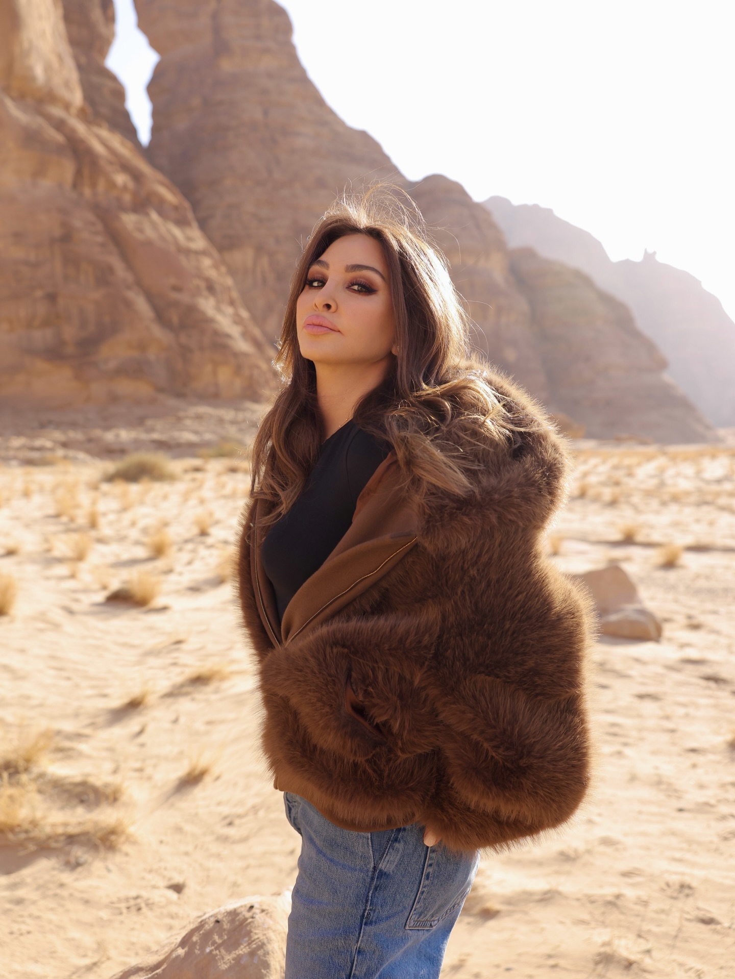 اختارت إليسا بنطال جينز بقصّة مريحة، نسّقته مع قميص أسود شكّل قاعدة حيادية أنيقة، قبل أن تضيف لمسة دافئة عبر جاكيت فرو باللون البني، بدا متناغماً مع ألوان الجبال المحيطة. أما الحذاء الرياضي الأبيض، فجاء ليؤكد على الطابع العملي والعفوي للإطلالة، دون أن ينتقص من رقيّها.