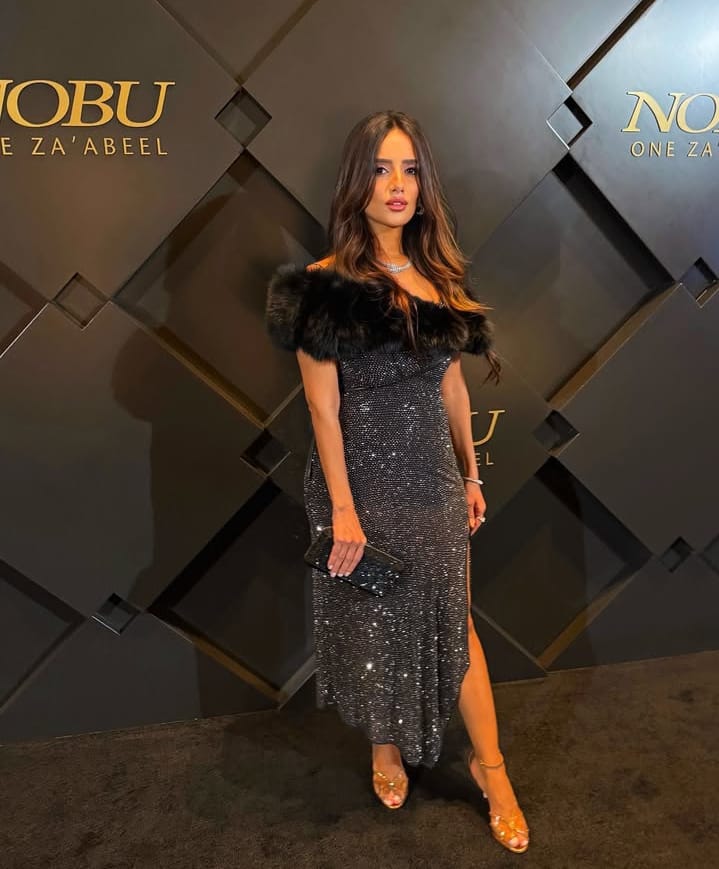 اختارت زينة لهذه المناسبة ثوبًا أسود براقًا ينسدل على الجسم ويصل إلى الكاحل مع فتحة جانبية، فيما اكتمل الإطلالة بشعر منسدل على الوجه بطريقة عفوية ومكياج هادئ. وقد أضفى الفرو الأسود المزدان على طول الصدر والأكتاف لمسة فاخرة وأنيقة على الزي، ليجمع بين الرقي والعفوية في الوقت ذاته.