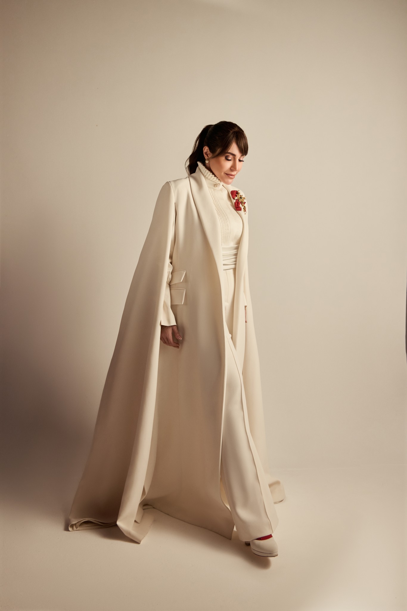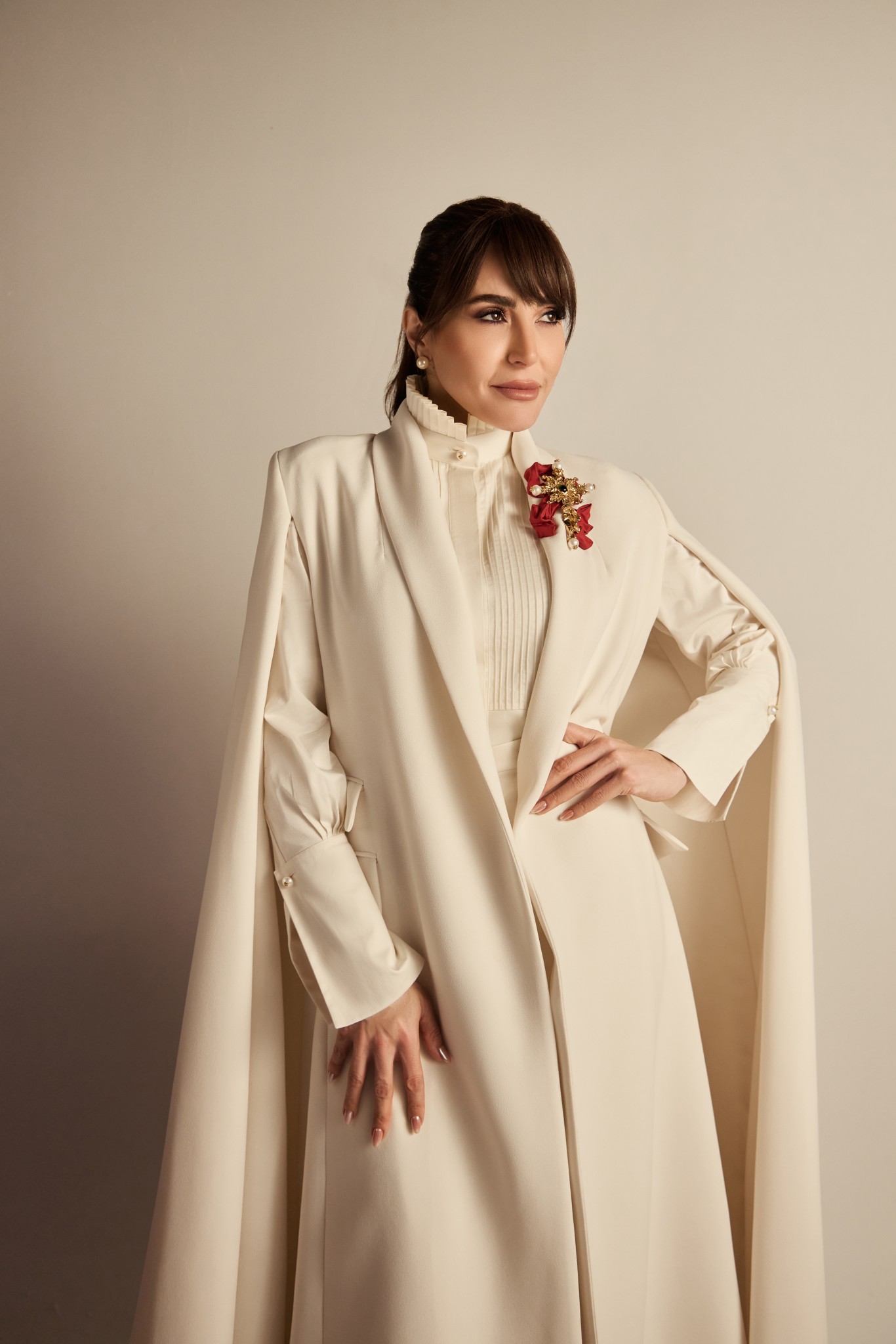 إطلالة جليلة، محتشمة، وعميقة رغم بياضها. عقدت شعرها إلى الخلف مع غرة تنسدل بتقشّف جميل، فيما زيّن بروش وردة حمراء ياقتها، كعلامة شاعرية وسط هذا البياض الصافي.