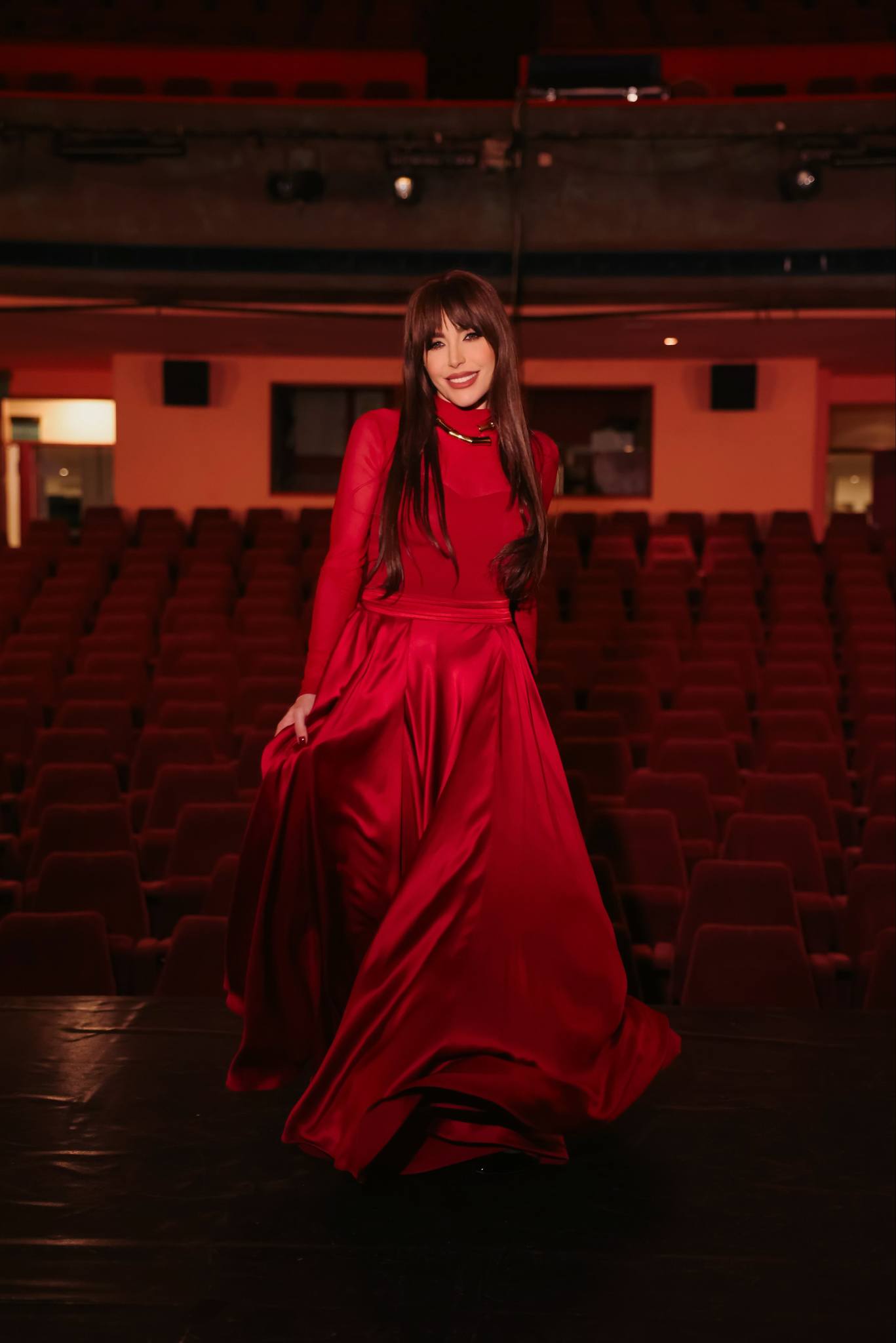 بثوب أحمر حريري متدفّق من تصميم Karoline Lang، اختارت عبير أن تعبّر عن الأنوثة بأسلوب ناعم. الجزء العلوي المحزوم برقة من قماش المولين، مع الياقة العالية والتدفق الحريري الواسع، خلق توازنًا بين البساطة والفخامة. الشعر المفرود وأحمر الشفاه الصاخب أكملا صورة أنثوية واثقة من دون مبالغة.