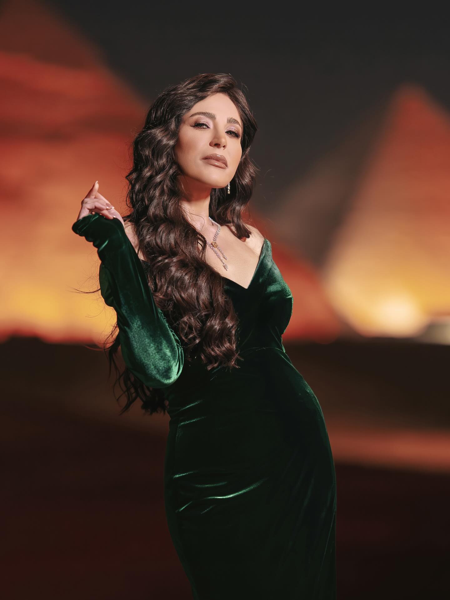 في مصر، تألقت عبير نعمة بثوب مخملي أخضر من تصميم سعيد قبيسي، بقصّة تنحت الجسم، وياقة مفتوحة مع أكمام أنيقة. شعر متدفّق بتموجات كثيفة، ومجوهرات من Himo Jewelry زيّنت العنق، ليصبح اللون الواحد حكاية عن الحياة، الفن، والغناء.