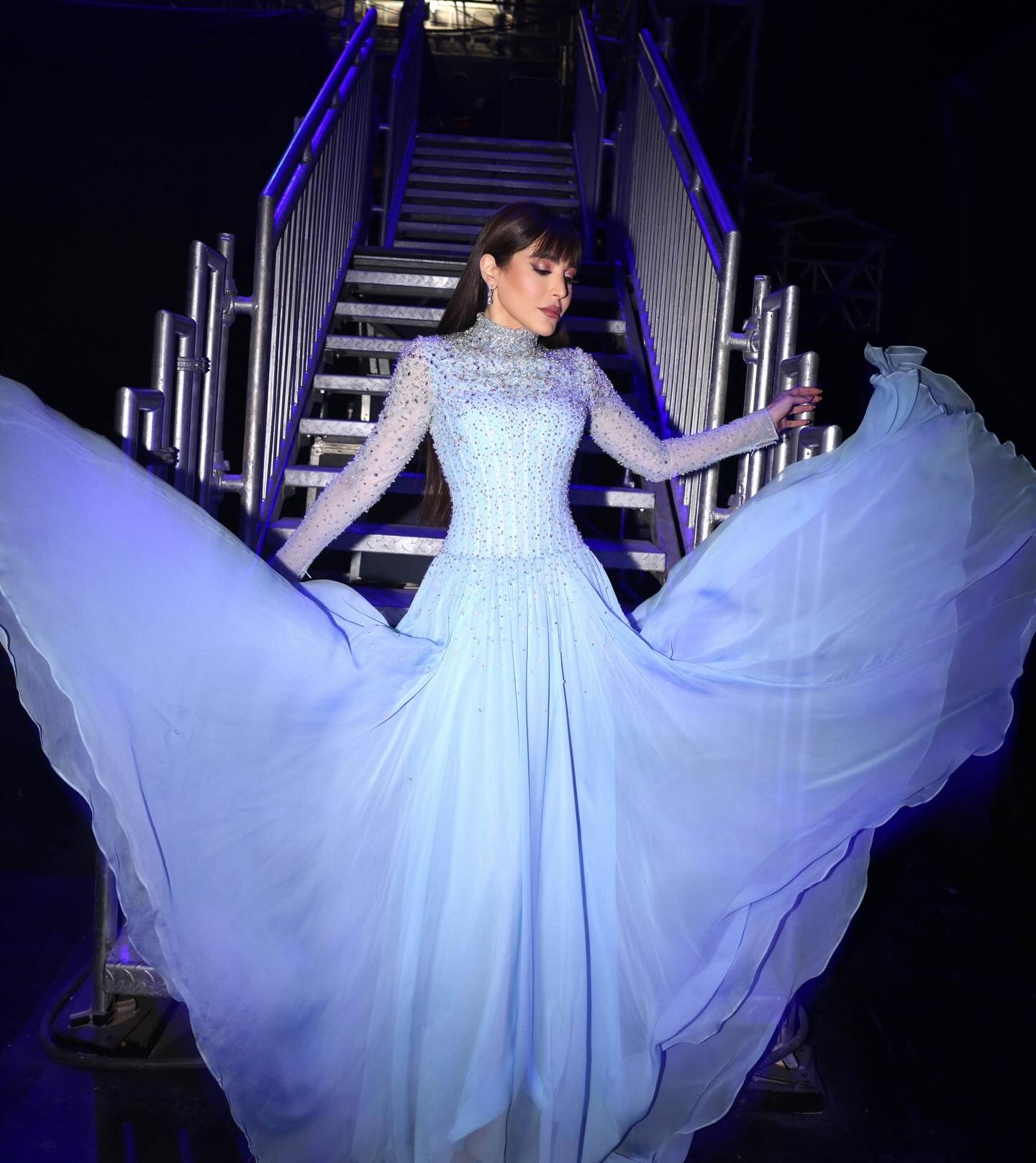 في سماء الرياض، تألقت عبير باللون السماوي الهادئ، في فستان طويل من توقيع رامي قاضي، بأكمام طويلة وياقة عالية، مع ستايل كورسيه ناعم. تناثرت الأحجار الكريستالية والخرز اللامع بأسلوب خفيف، فيما انسدلت التنورة بقصّة واسعة أغنتها الثنيات.