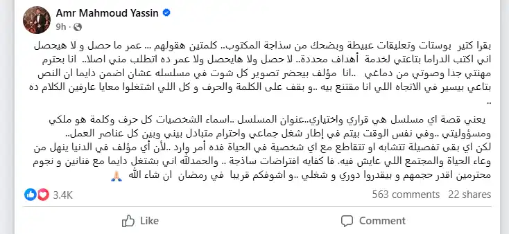 وعبر حسابه الرسمي على منصة "فيسبوك"، نفى عمرو محمود ياسين ما وصفه بالافتراضات غير المنطقية، مؤكداً أن المسلسل لا يتناول قصة حياة ياسمين عبد العزيز لا من قريب ولا من بعيد. وشدد ياسين على احترامه لمهنته ككاتب، موضحاً أن أعماله الدرامية لا تُكتب لخدمة أفراد أو لتصفية حسابات شخصية أو لتحقيق أهداف بعيدة عن الفن، معرباً عن استغرابه من "سذاجة" بعض التحليلات التي حاولت الربط بين الواقع والخيال الدرامي في العمل.