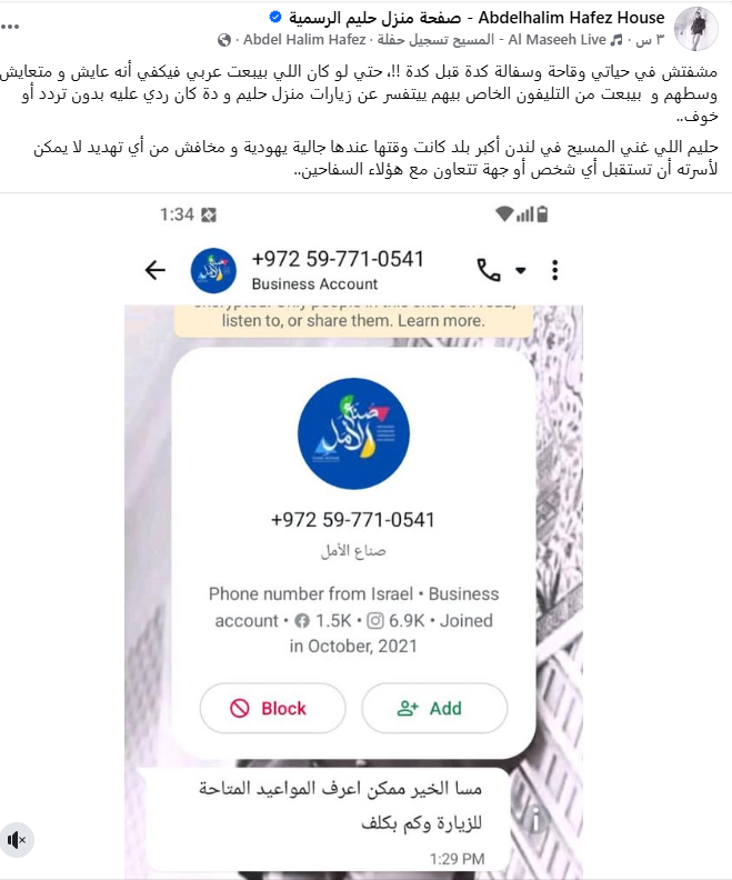 أصدرت أسرة الفنان الراحل عبد الحليم حافظ بيانًا رسميًا عبر حسابها على فيسبوك، أكدت فيه أن منزل العندليب غير متاح للزيارة من قبل الإسرائيليين تحت أي ظرف، مشددة على رفض أي محاولة للتواصل أو الزيارة دون احترام إرث الفنان وتاريخه الفني.