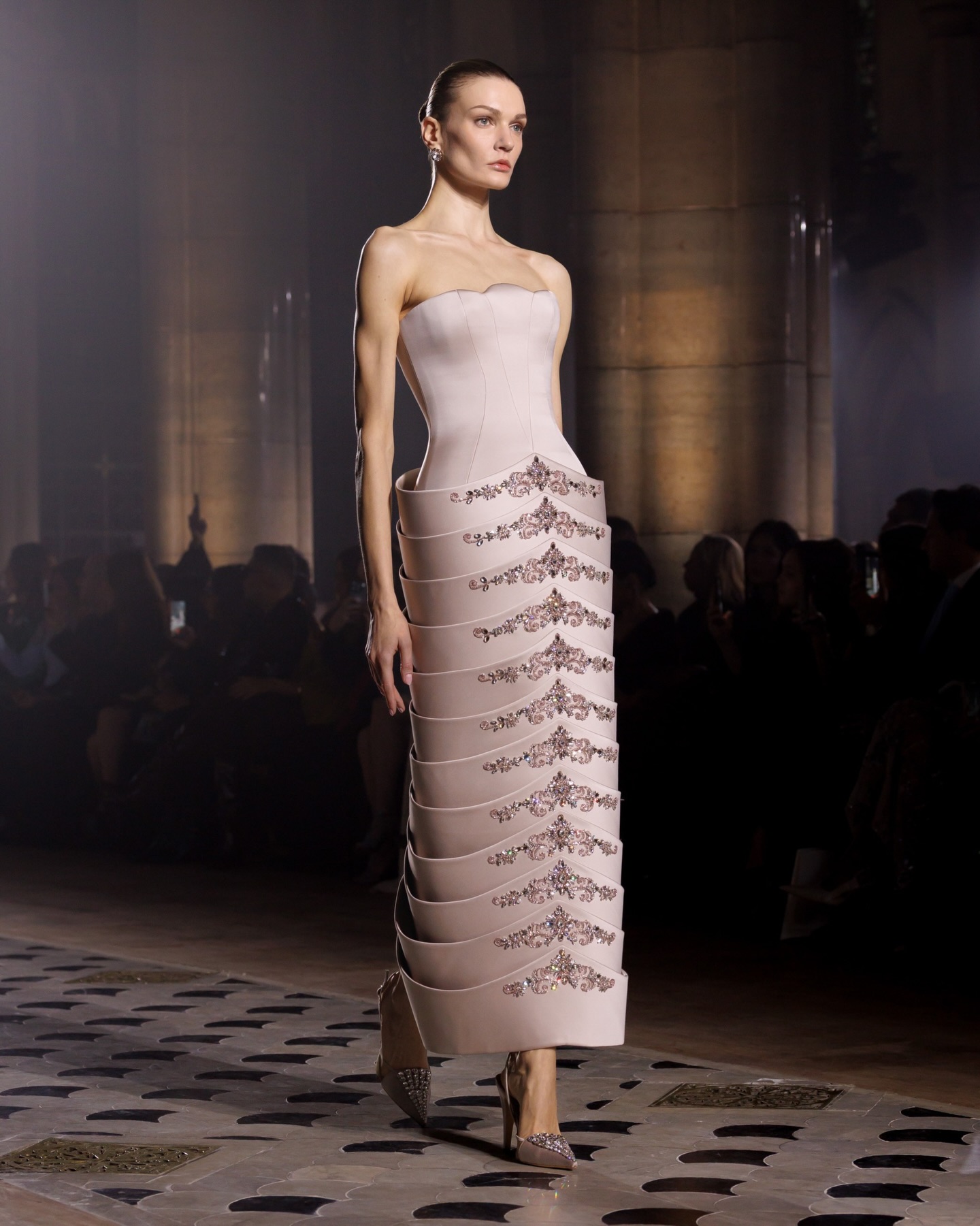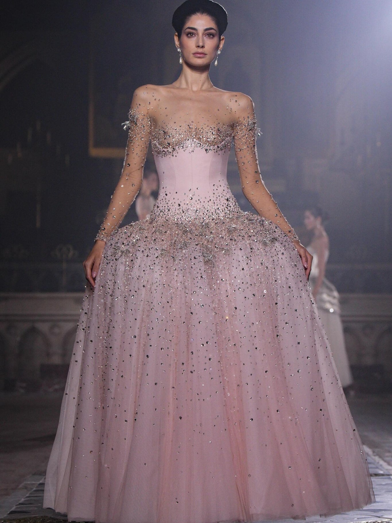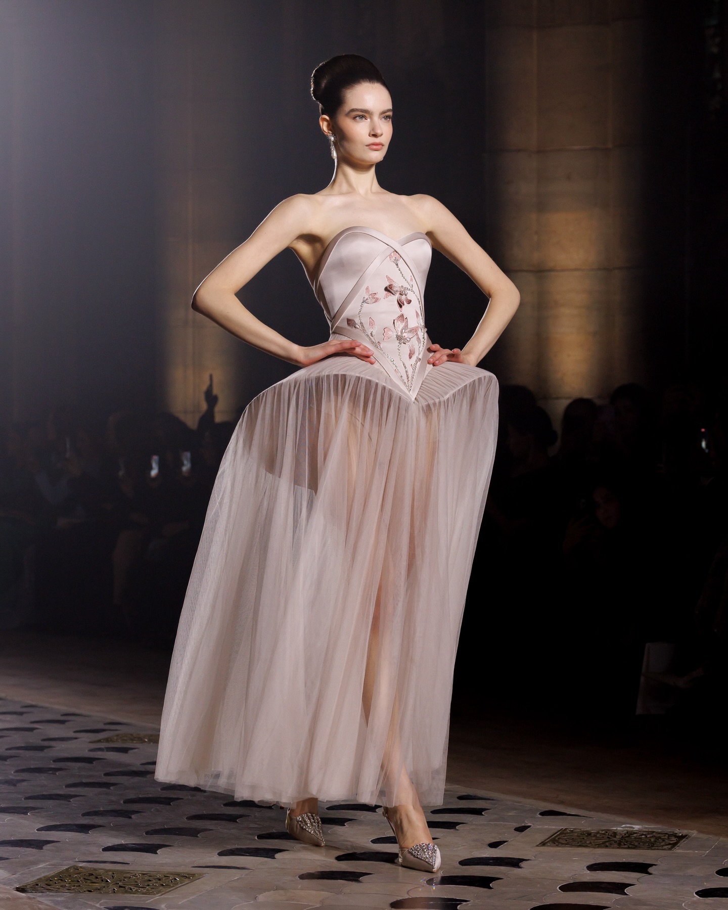 كما تميزت المجموعة باستخدام التول، الأورغانزا، والساتان، مع تطريزات دقيقة تلتقط الضوء، فتضيف بريقًا خفيفًا لكل حركة من حركة العارضات، ما جعل العرض يبدو كقصيدة مرئية للحب والأناقة، مع لمسة هندسية دقيقة تُبرز جمال الجسد وأنوثته.