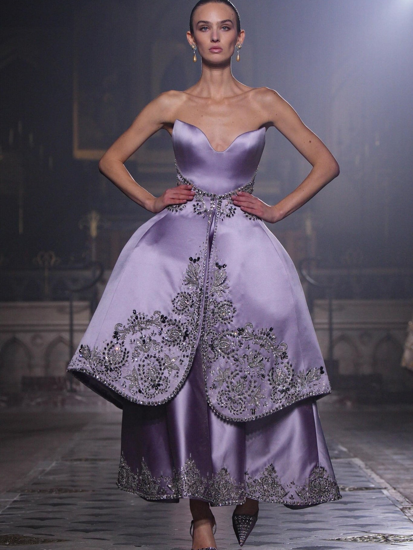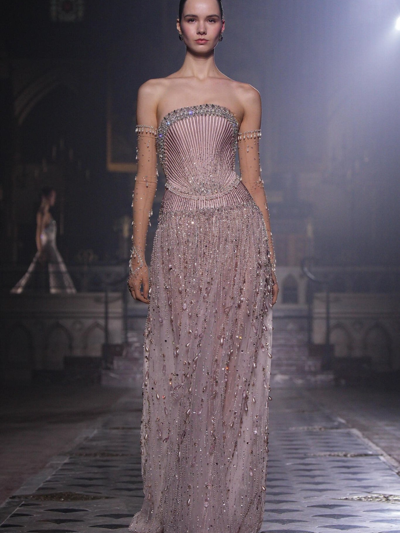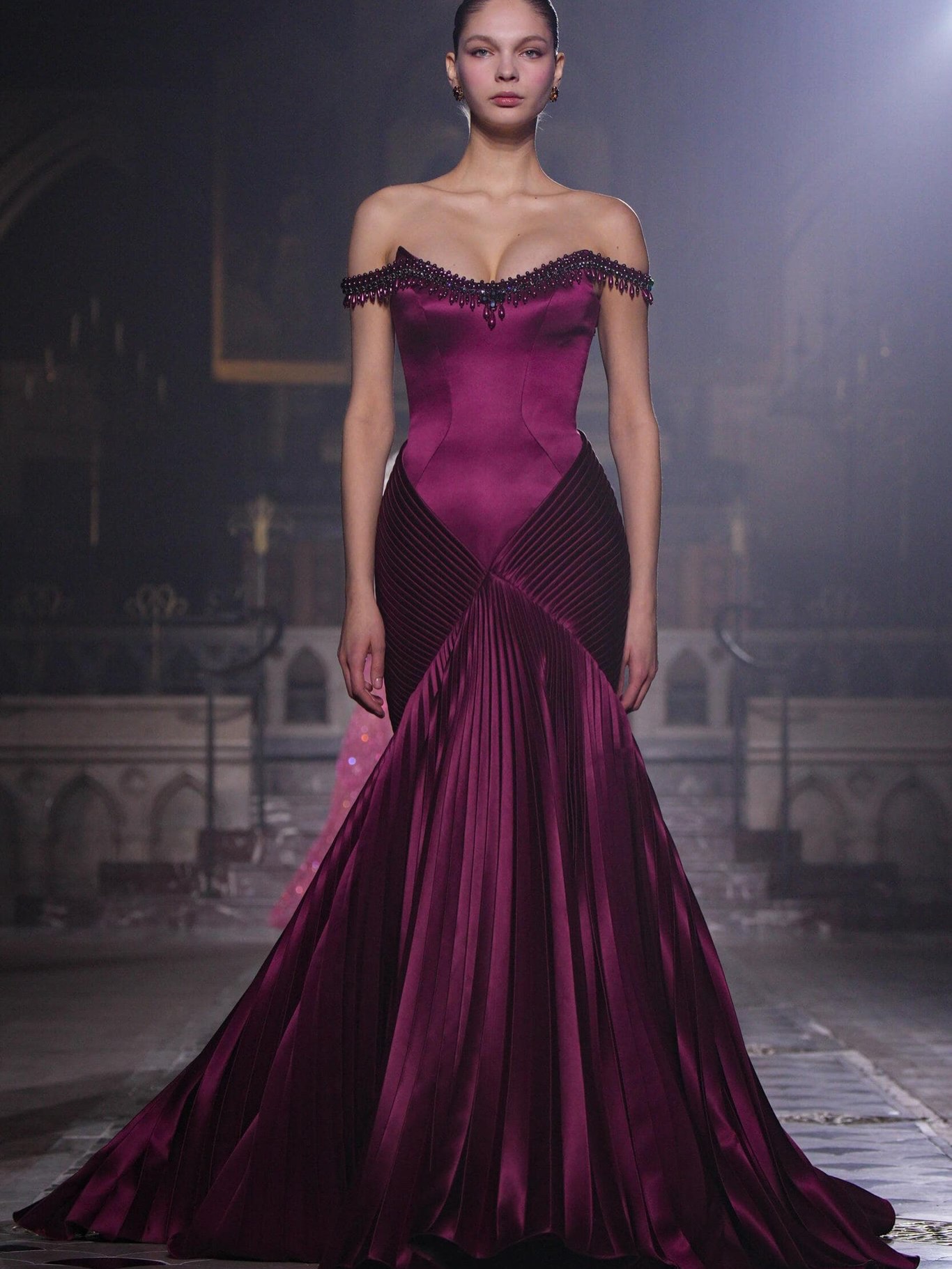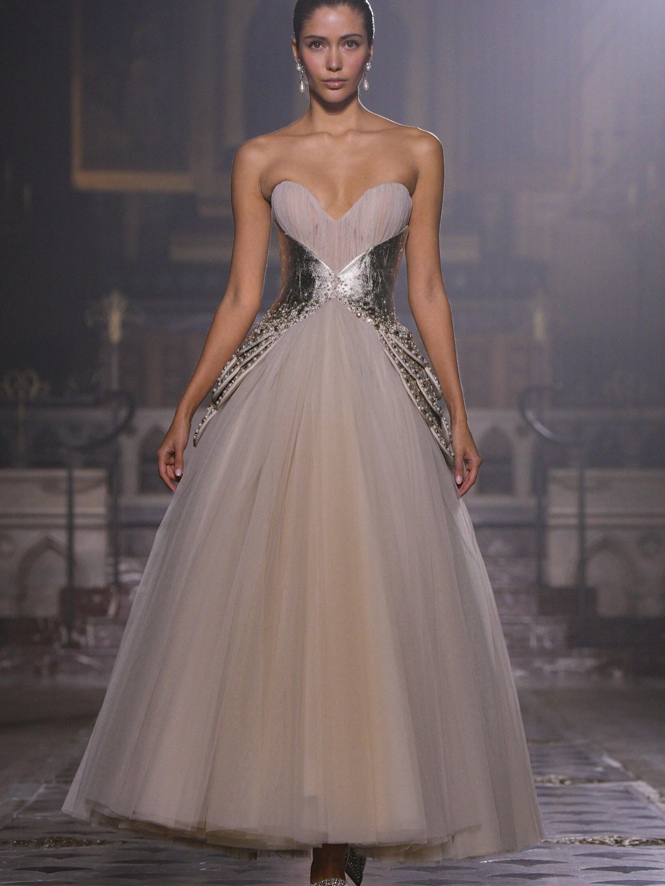 كما تميزت المجموعة باستخدام التول، الأورغانزا، والساتان، مع تطريزات دقيقة تلتقط الضوء، فتضيف بريقًا خفيفًا لكل حركة من حركة العارضات، ما جعل العرض يبدو كقصيدة مرئية للحب والأناقة، مع لمسة هندسية دقيقة تُبرز جمال الجسد وأنوثته.