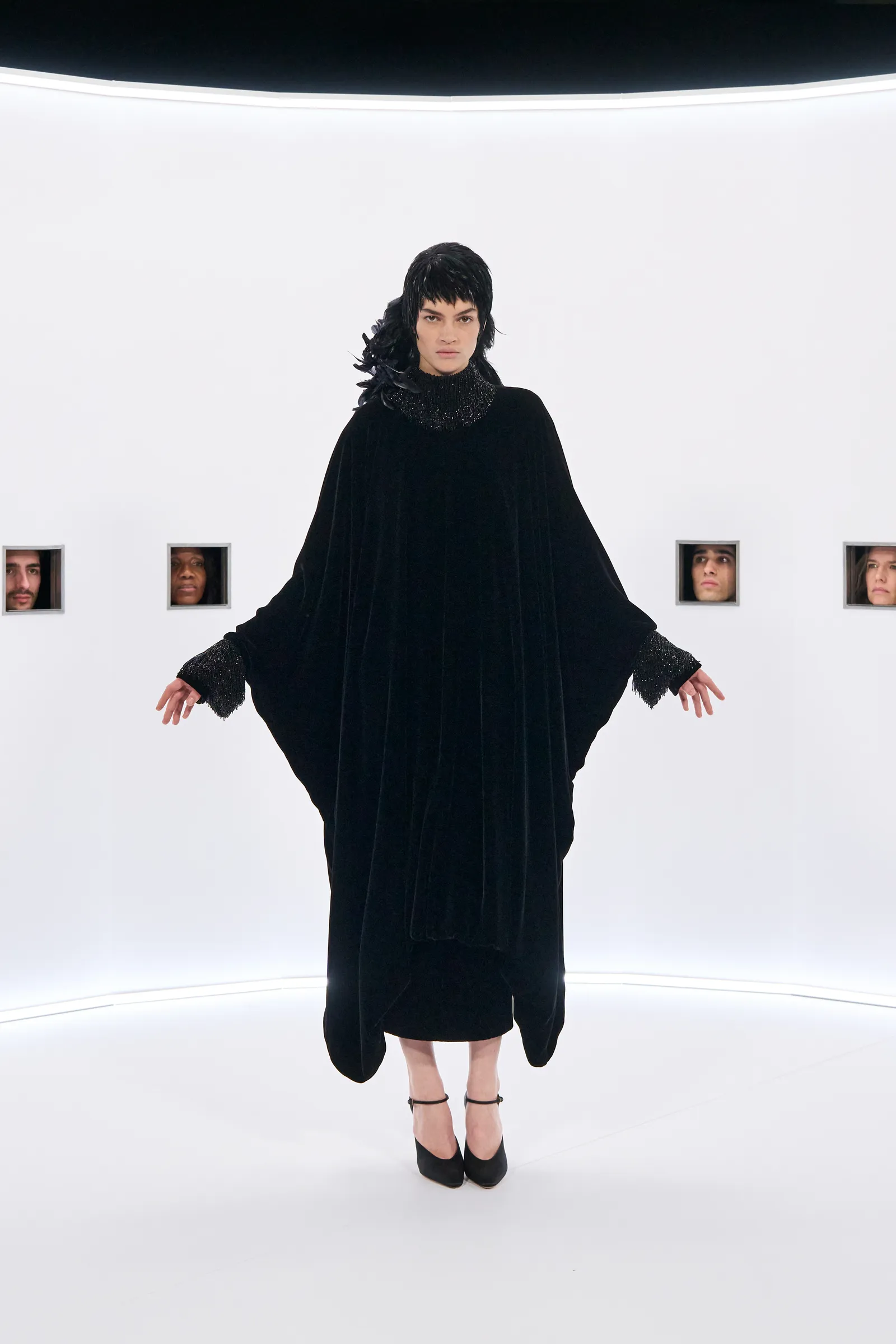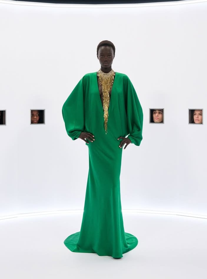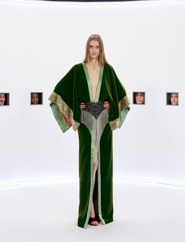عباءات شيفون مرصّعة بهندسة فضية، معاطف كيمونو مخملية على طريقة بواريه، وفساتين توحي بأن غلوريا سوانسون خرجت للتو من لقطة قريبة منسية.