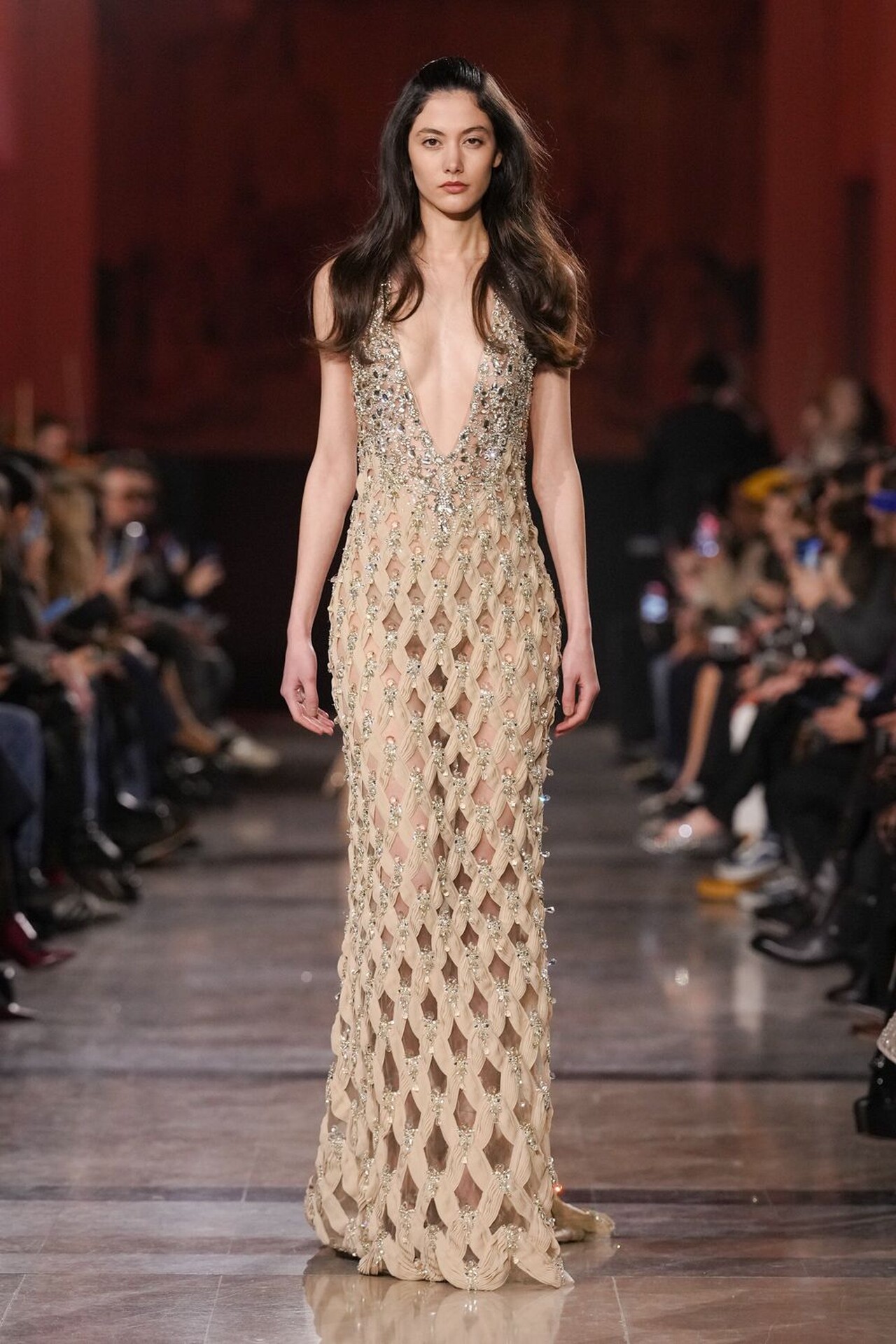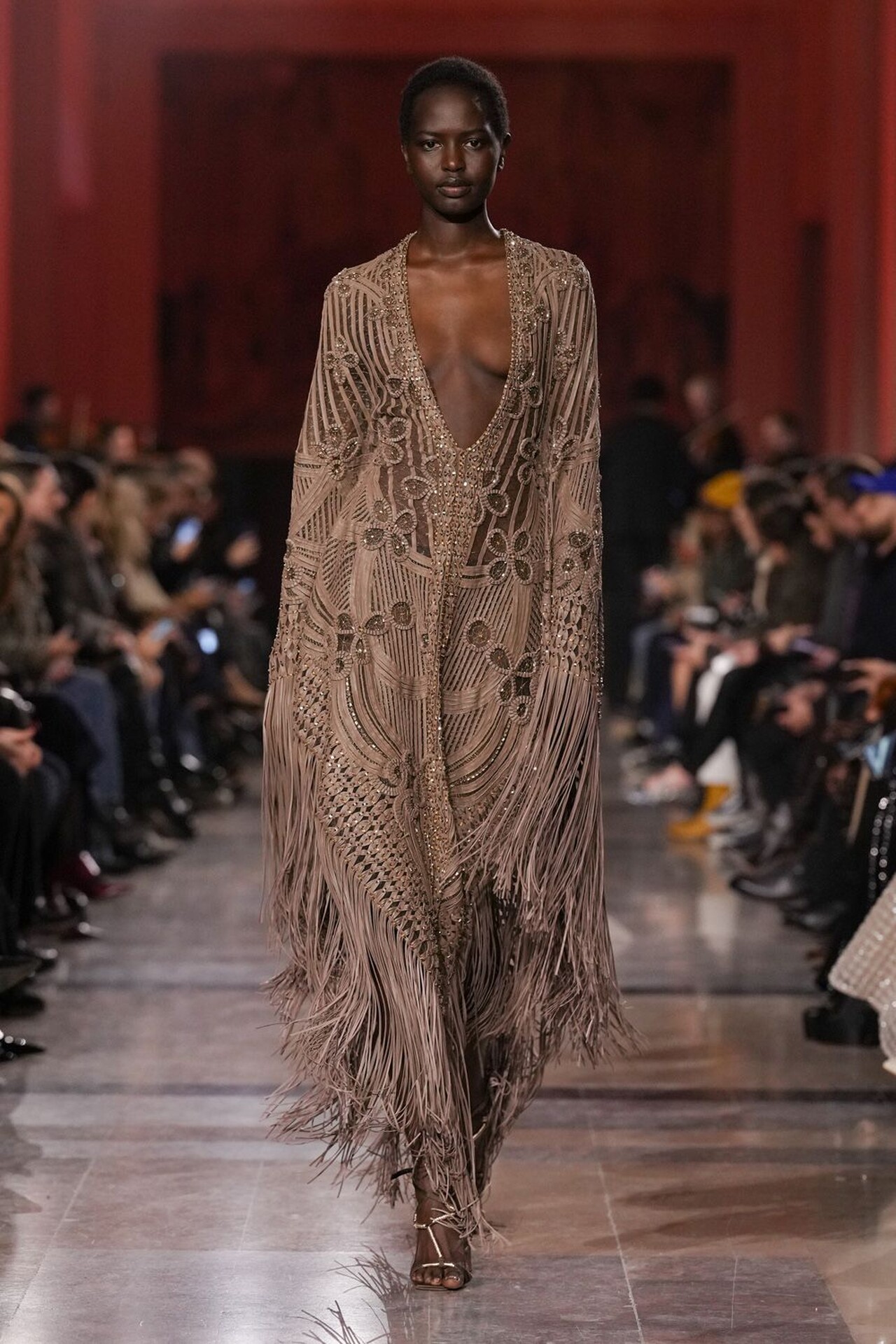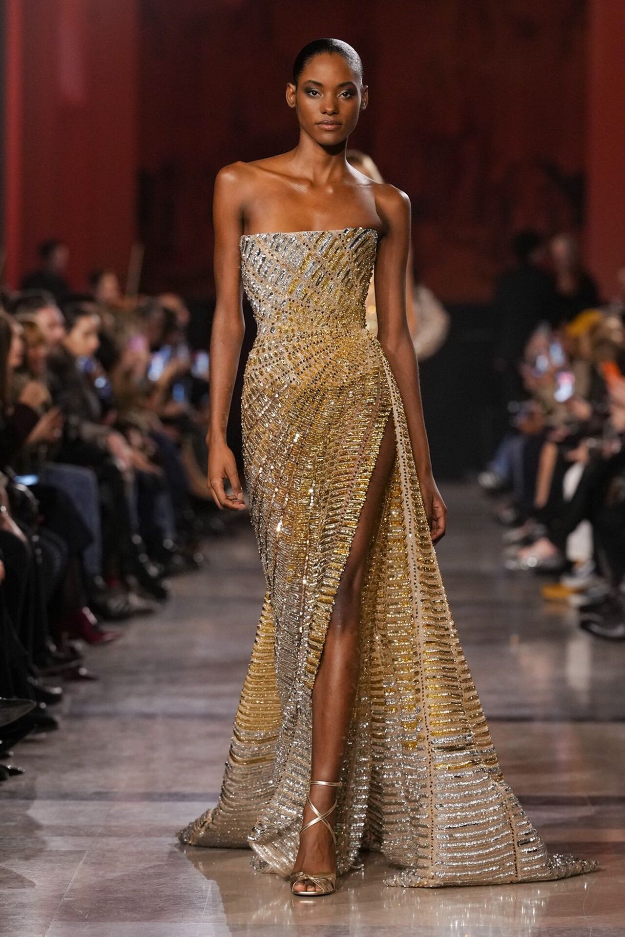 استحضرت مجموعة إيلي صعب تدرجات مشبعة بالذهب المعدني، البرونزي، وبني الشوكولاتة بالحليب، لتخلق توهجاً مستمراً تحت أشعة الشمس على المدرج.
