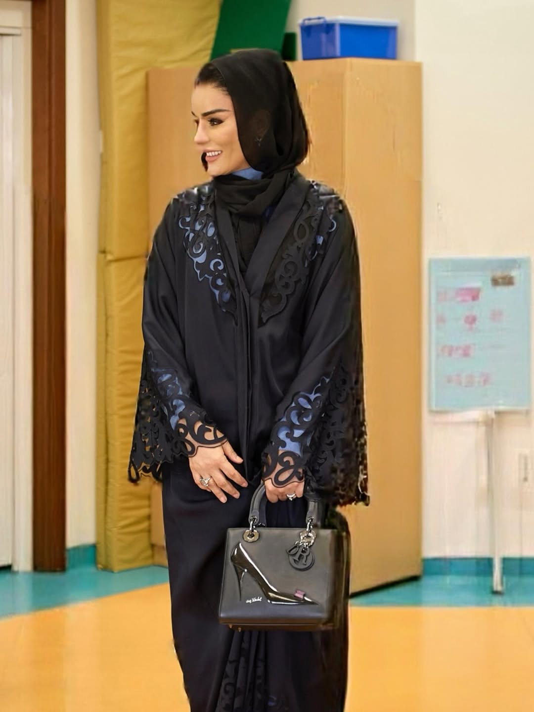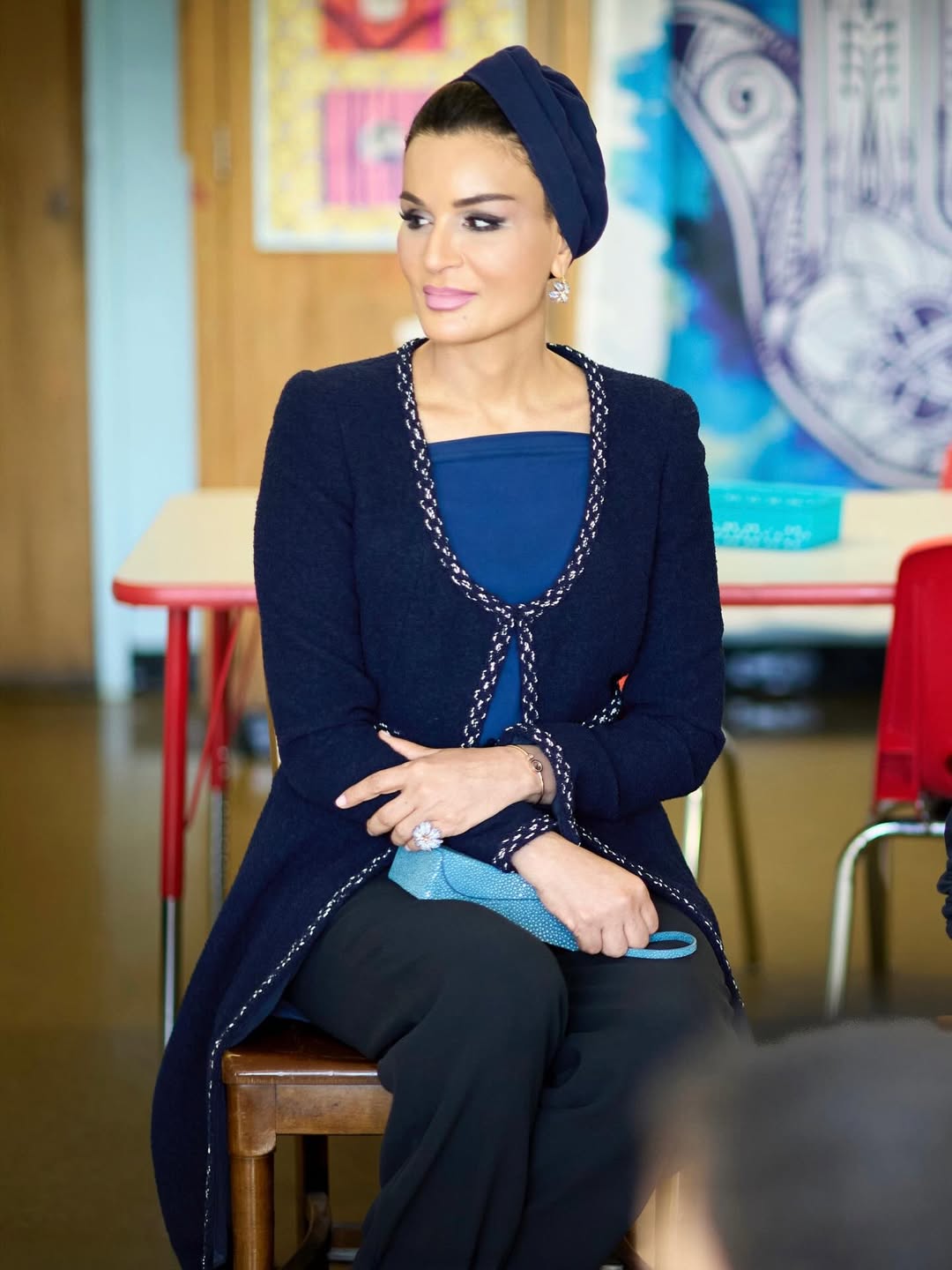 في احدى إطلالتها رسمية، أثبتت الشيخة موزة قدرتها على موازنة اللباس المهني مع الذوق الشخصي. ارتدت عباءة كحلية مع لمسات متعددة من الأزرق، تتناغم مع قطع شانتيل عتيقة من شانيل، وسوار الماس من شوبارد، وحقيبة كلاتش من irisnobleparis.@