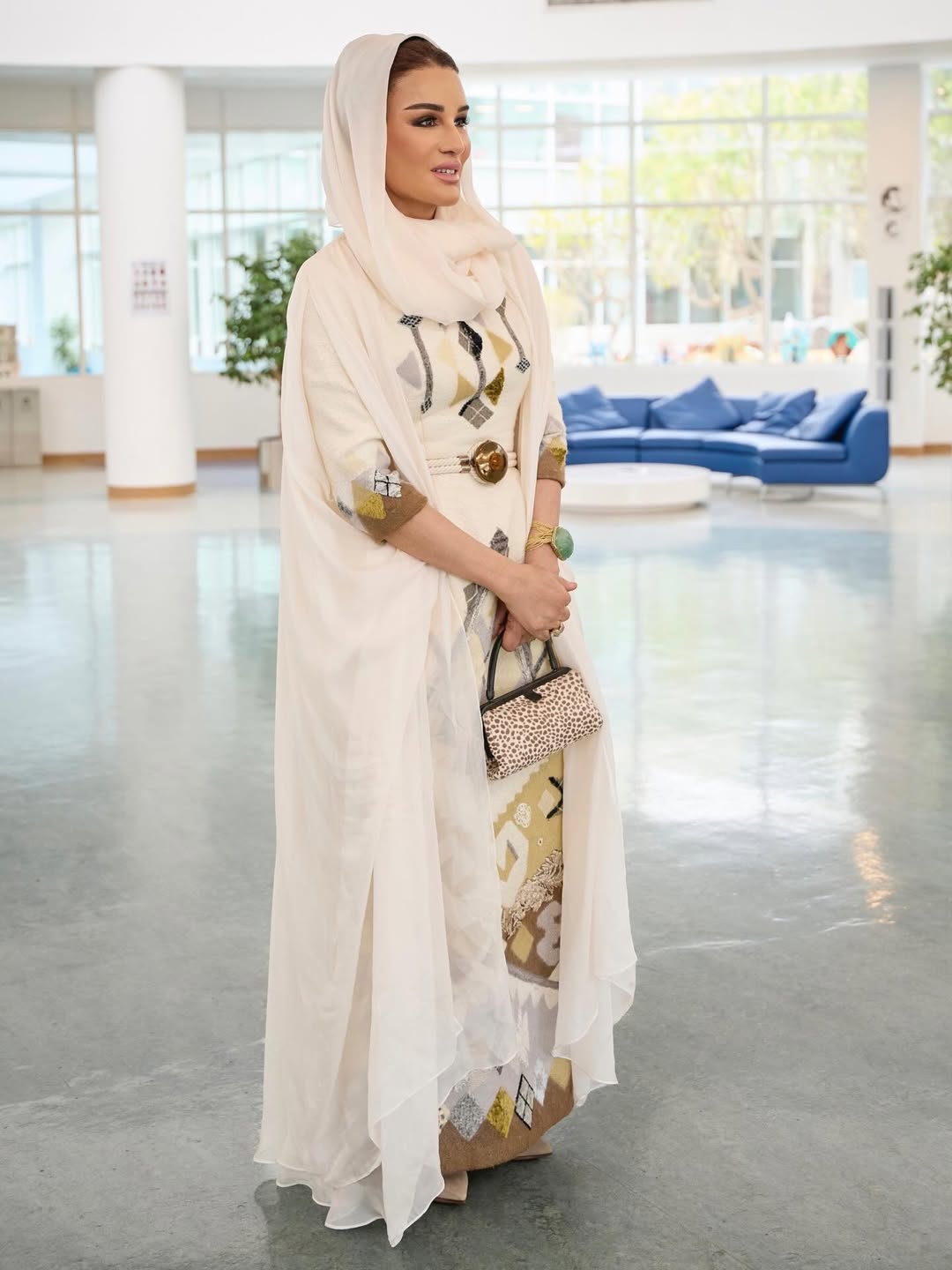 ارتدت الشيخة موزة فستانًا أبيض من دار @christophejosseofficiel مزينًا بأنماط هندسية وزهرية مع عباءة بيضاء أنيقة، مصحوبة بـ حقيبة كلاتش بنقشة جلد الفهد وسوار زمردي كبير.
