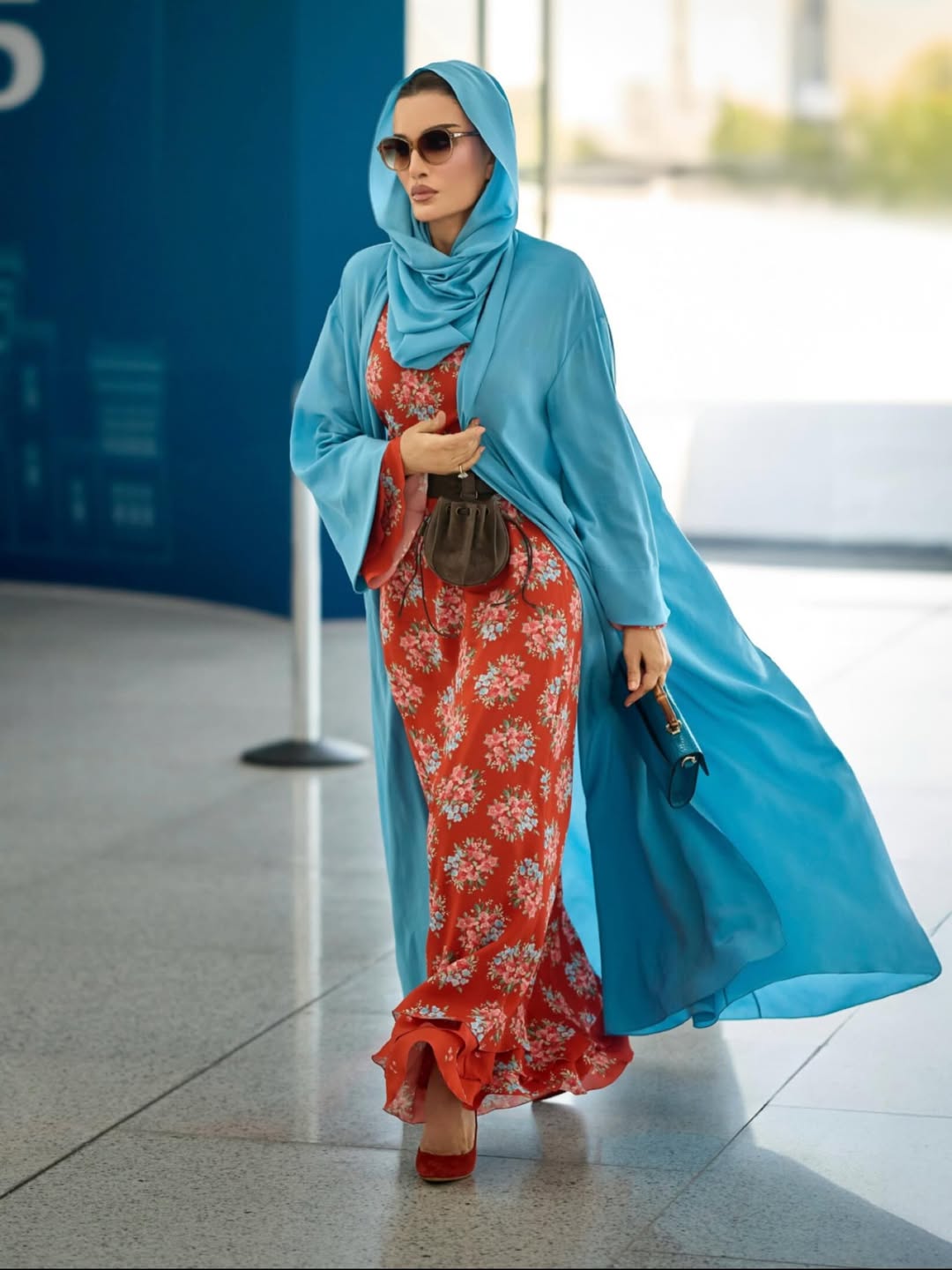 عباءة زرقاء وفستان مطبع بالزهور : ثقة وأناقة متجددة