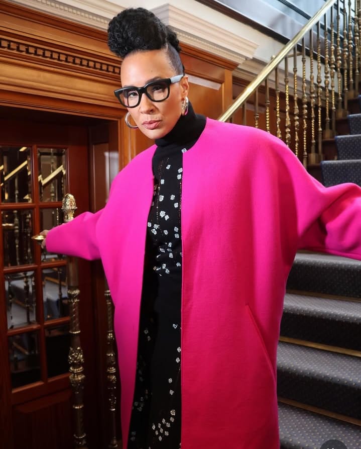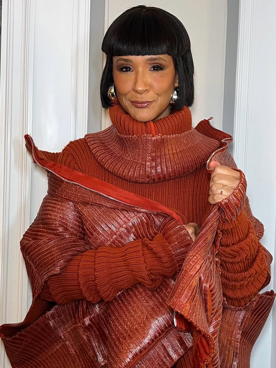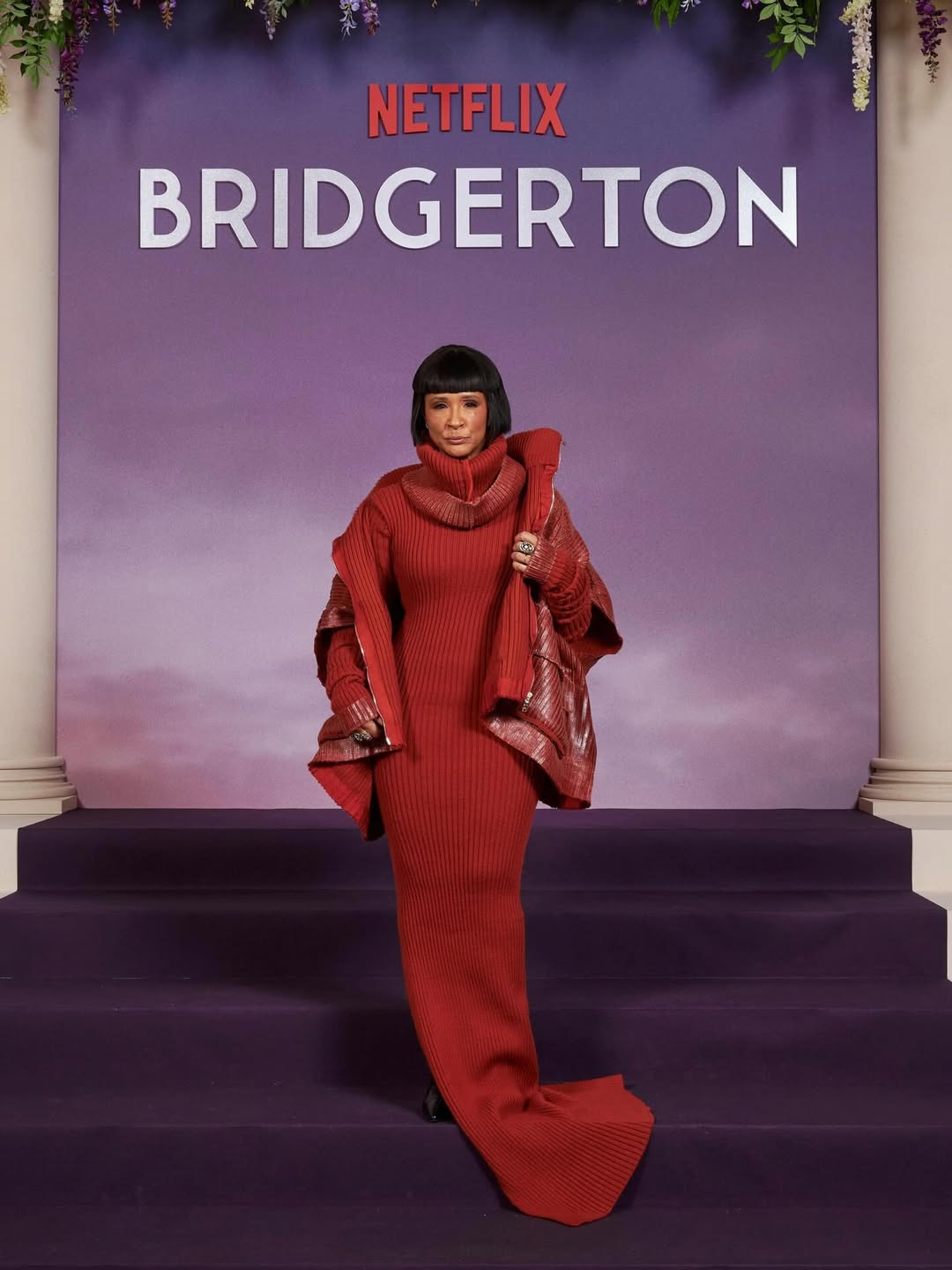 كما سبق أن أطلت بفستان صوفي طويل باللون الأحمر، بقصة مجسمة تعانق القوام، وأكمام طويلة وذيل جانبي منسدل، مع ياقة عريضة مطوية إلى الأمام. ورافقت الفستان بجاكيت أوفر سايز منسوج بنفس الخامة واللون، مع فتحات للذراعين وسحاب أمامي، واعتمدت تسريحة الكاريه وأقراطًا فضية.