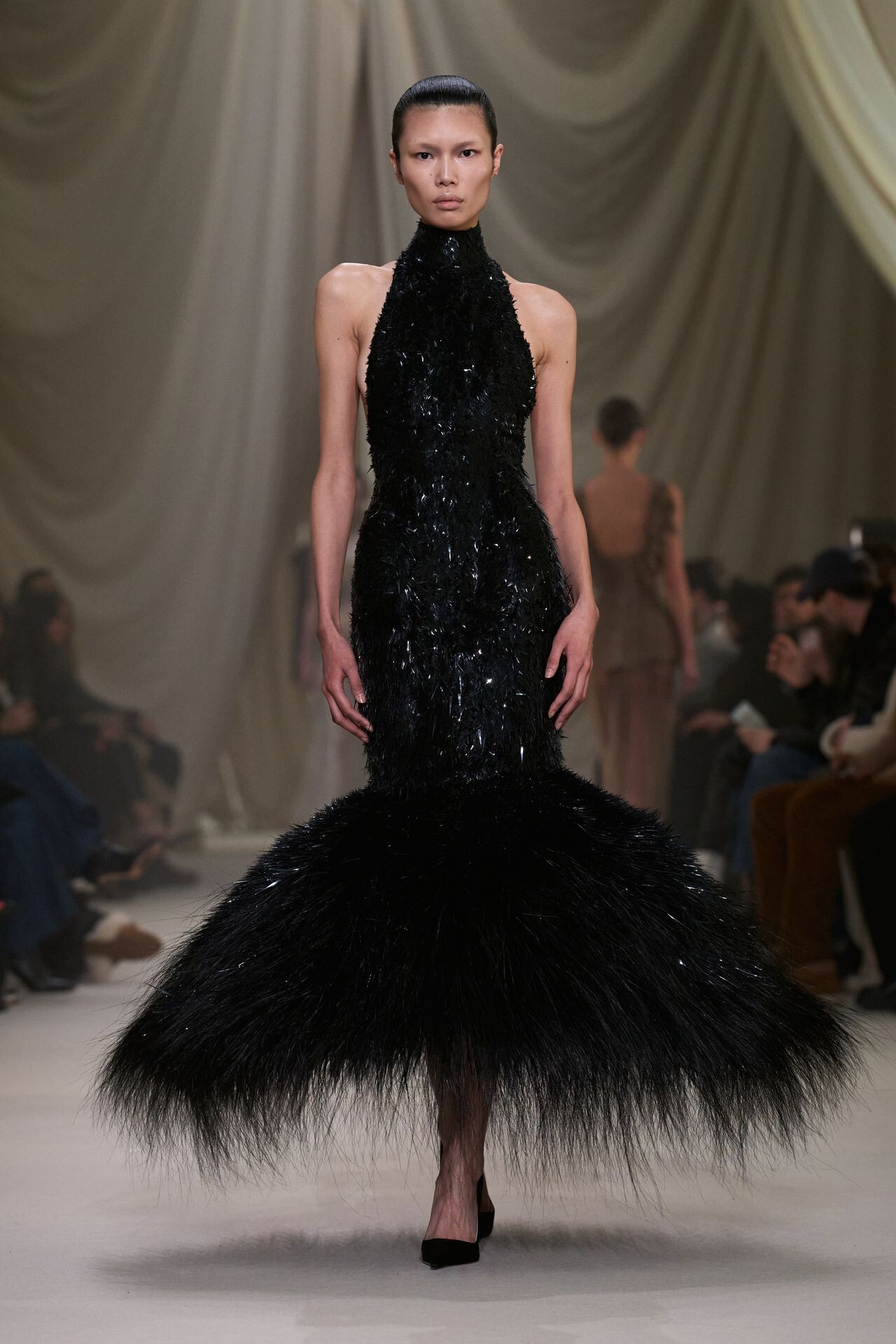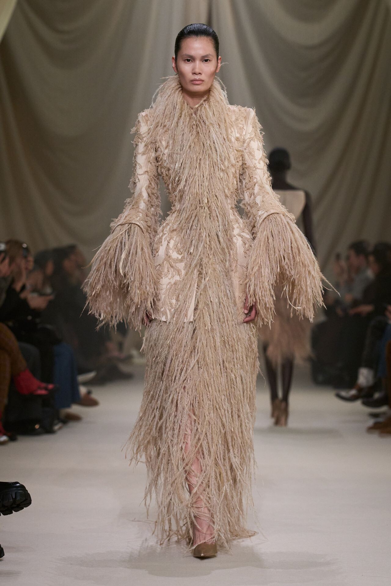 شهد العرض لحظات مذهلة حيث تحولت الحرفية إلى تجربة حسية؛ معالجة يدوية خلقت تأثيرًا ناعمًا رطبًا، والريش أضاف حركة وانسيابية، بينما تظهر الكورسيات بمثابة استعارة للجمال المدمج مع التوتر.