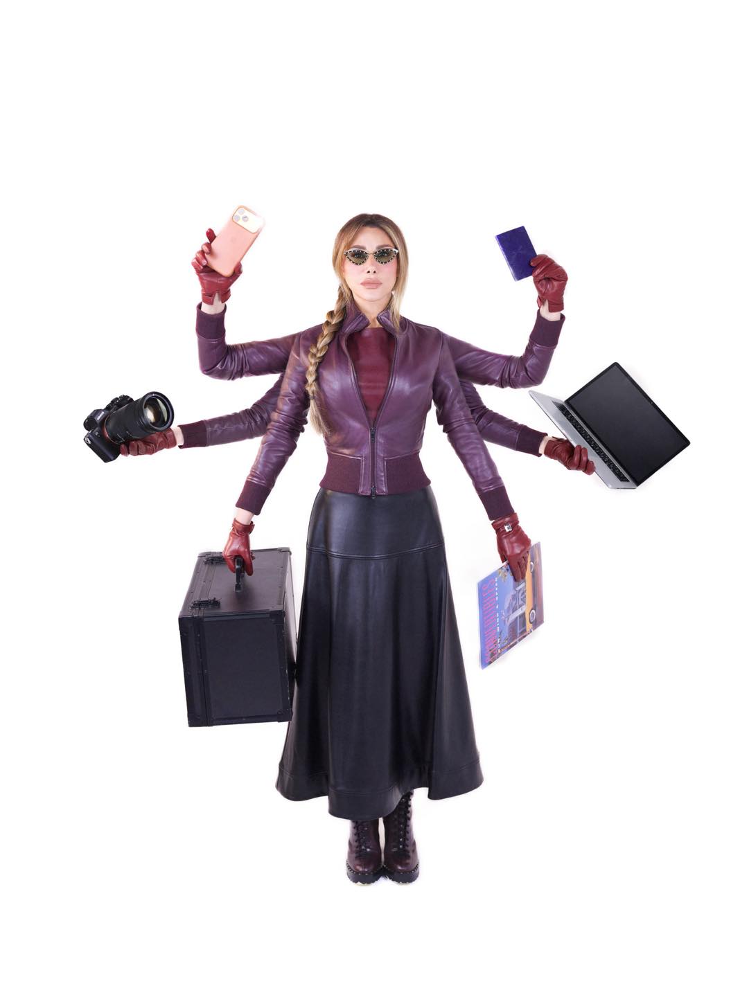الستة أذرع تبدو كترجمة رمزية لامرأة تدير أكثر من عالم في آن واحد: العمل المكتبي، الصورة، التواصل، السفر، القرار. نجوى هنا ليست أيقونة جامدة، بل كيان متحرك، يعمل ويفكر ويتنقل بلا توقف. كأنها تقول إن يومياتها لا تُدار بيد واحدة، بل تحتاج إلى منظومة كاملة من التركيز والقوة والانضباط.