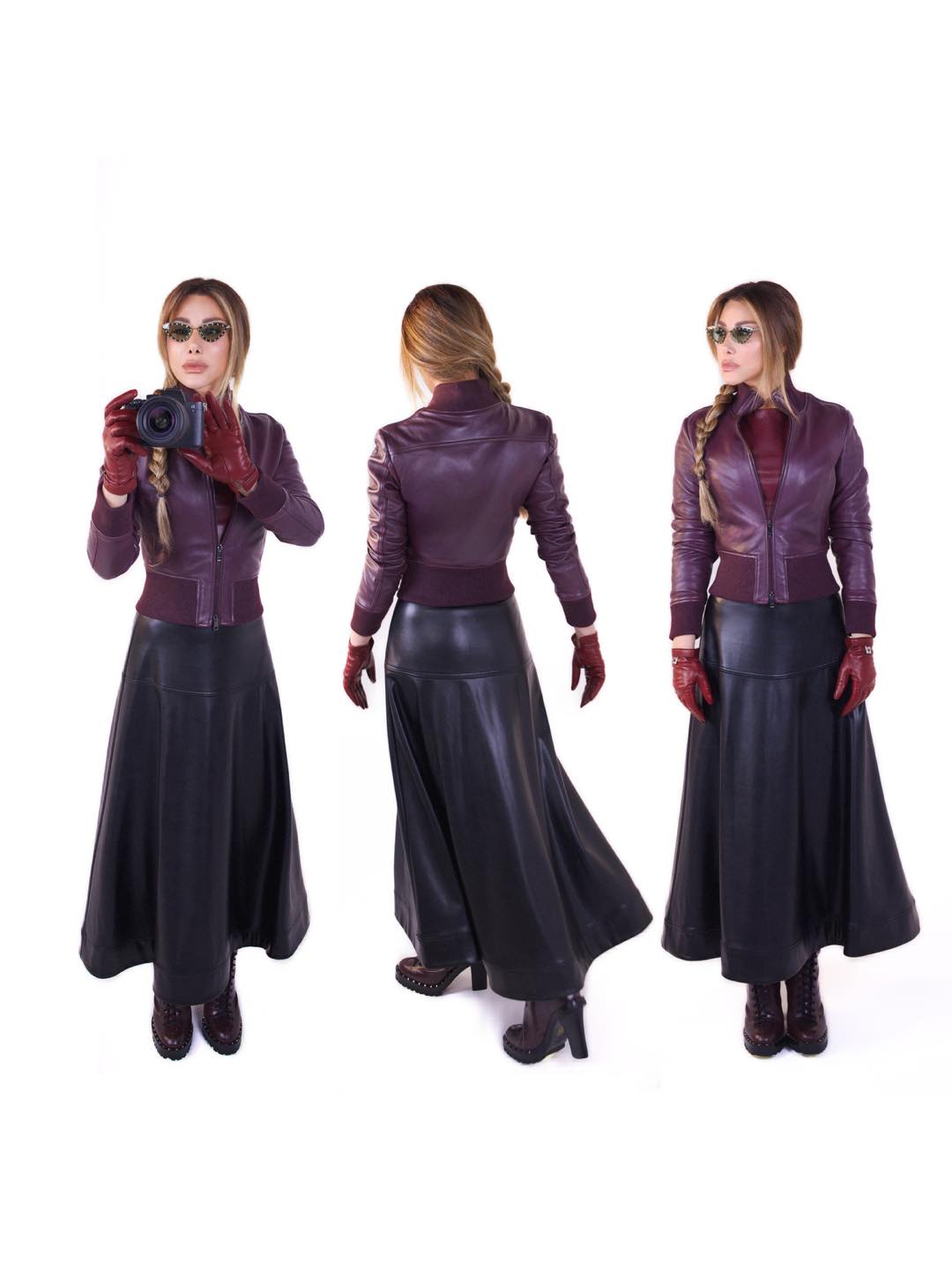 جاكيت جلدية قصيرة بلون داكن، توب جلدي بدرجة أفتح، وقفازات بلون ثالث من العائلة نفسها، وكأن اللون الواحد يروي أكثر من مزاج. أما التنورة الجلدية السوداء الواسعة، فأضافت ثقلًا أنيقًا يوازن حدة القطع العلوية.