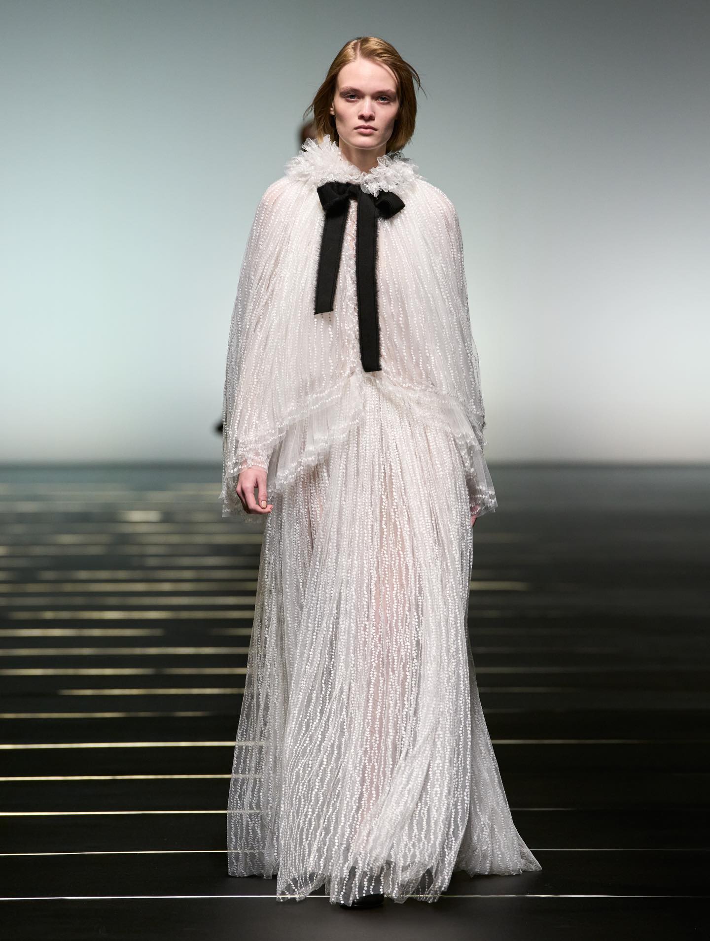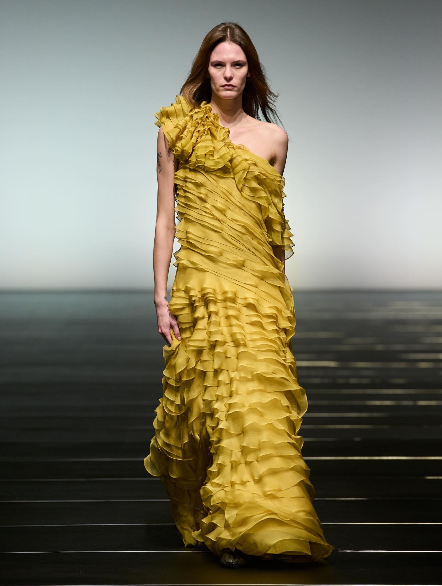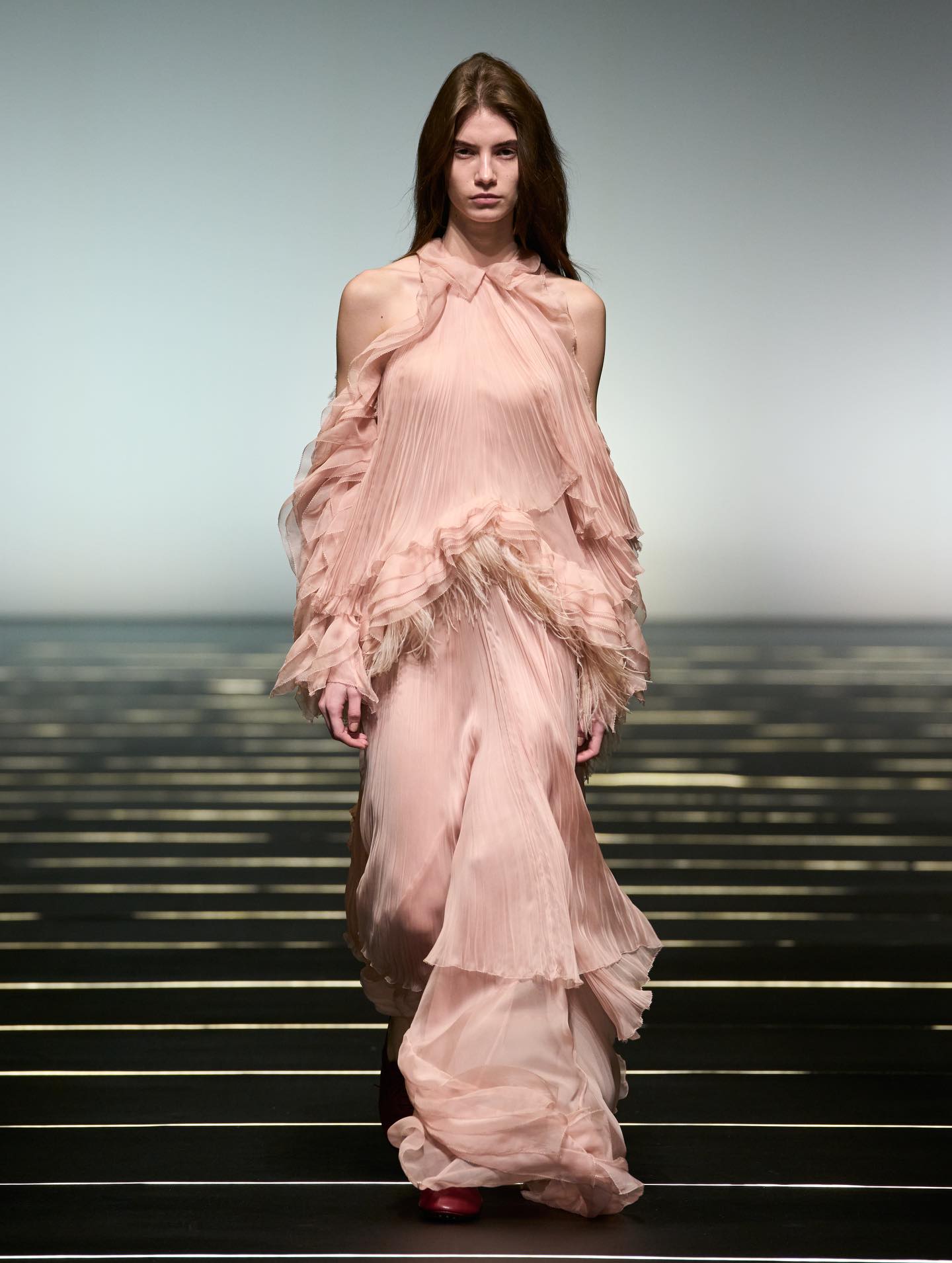 واعتمدت الدار لوحة ألوان أنيقة ضمّت الأسود والعاجي والياقوتي والباذنجاني، واستُكملت الإطلالات بأحذية تنوّعت بين البوت العالي والتصاميم المسطّحة. وزُيّنت بعض القطع بتطريزات خفيفة من الخرز ولمسات محدودة من الريش، في تجسيد لرؤية سيرافيني للمرأة التي تتألّق لنفسها أولاً، وتستمد قوتها من داخلها، لتنعكس أناقتها بنعومة راقية بعيدة عن المبالغة.