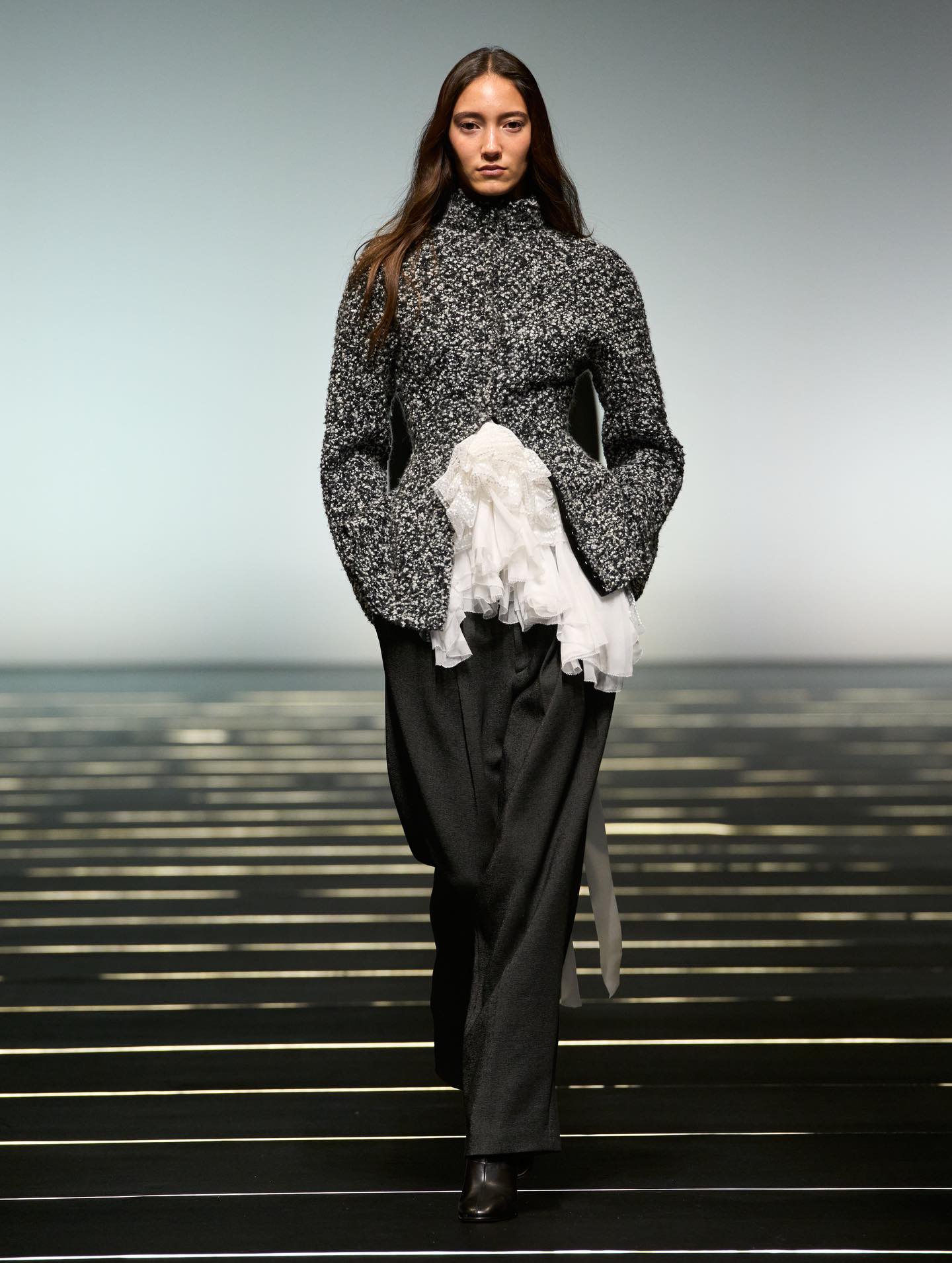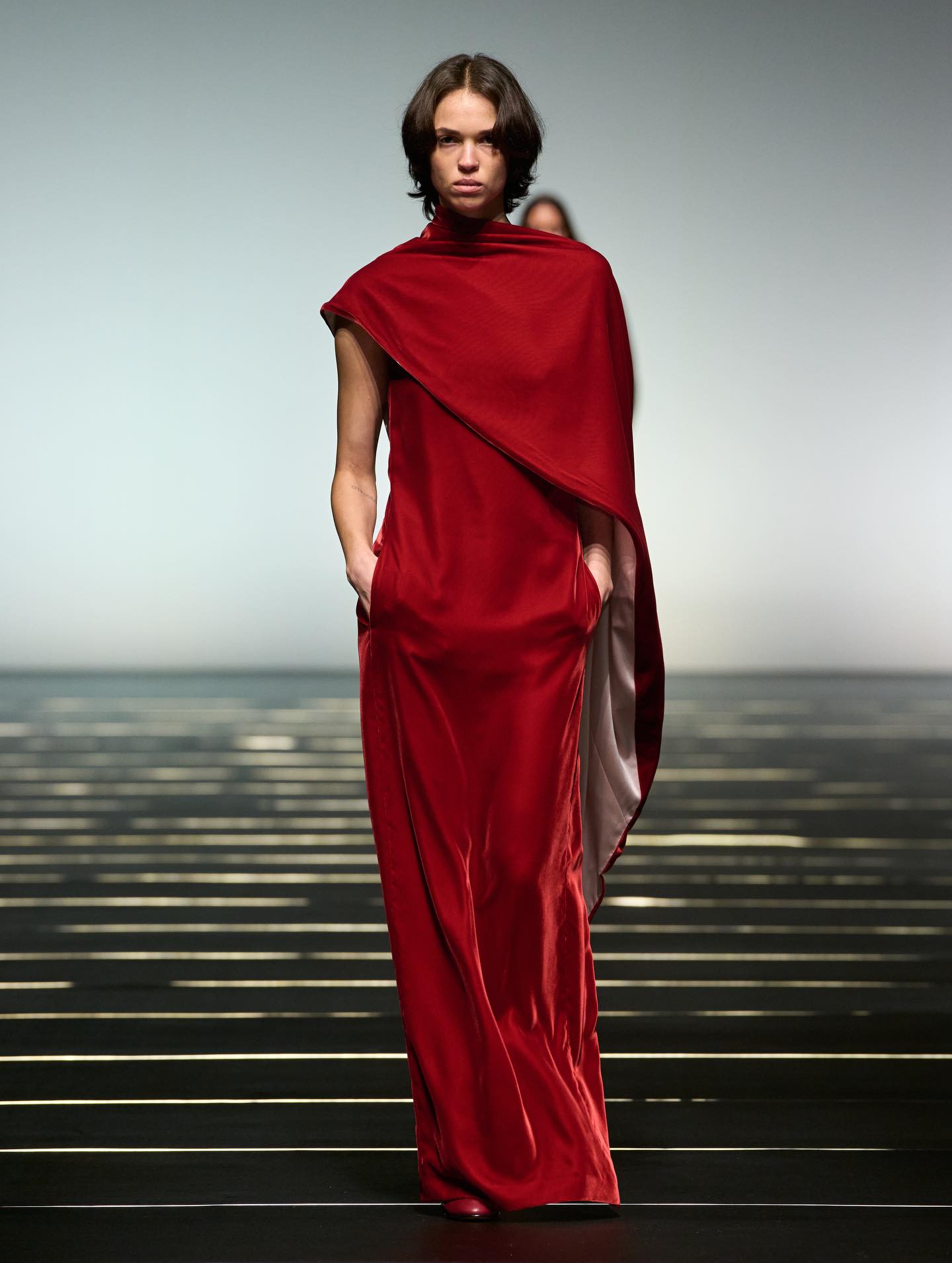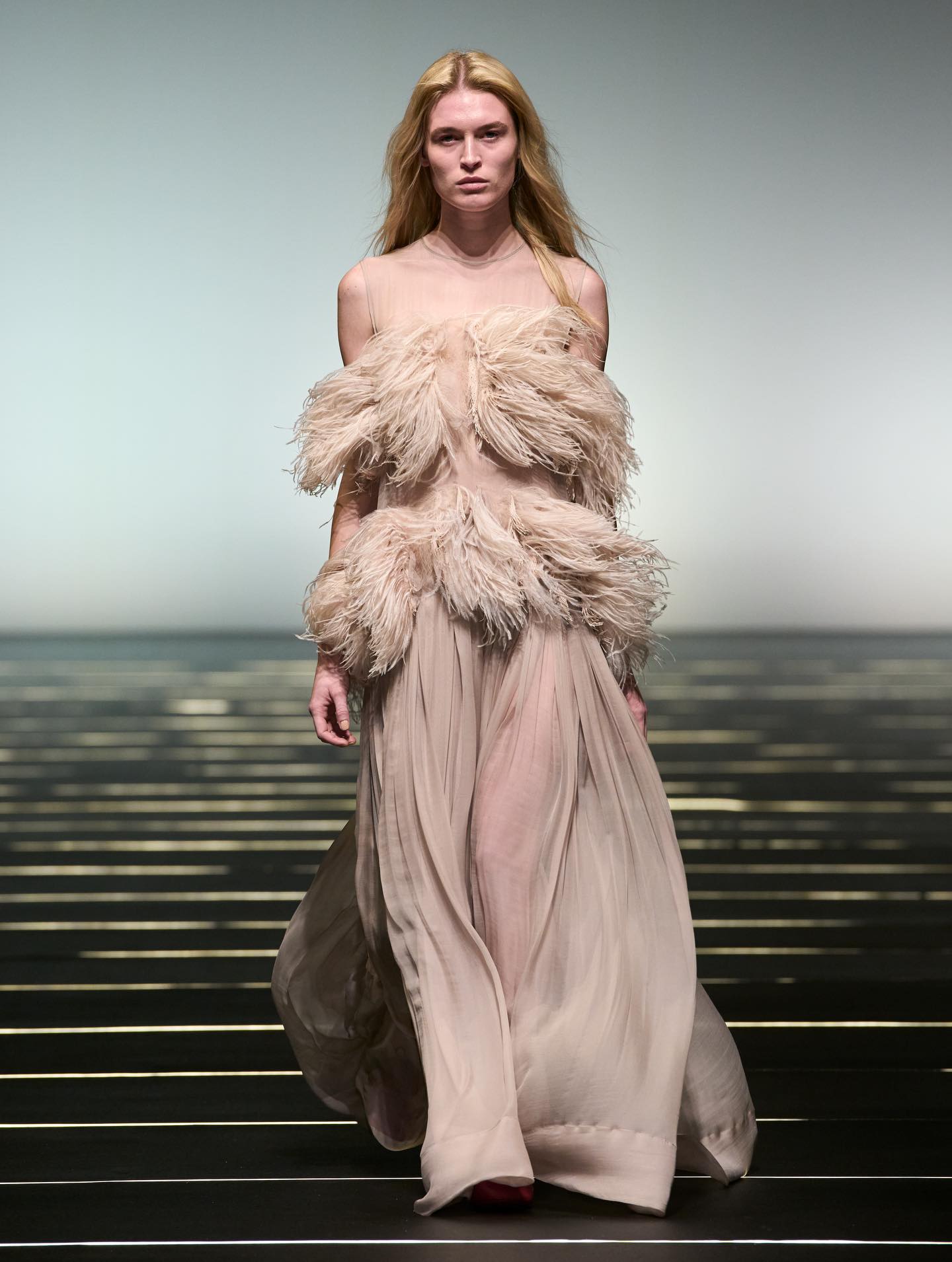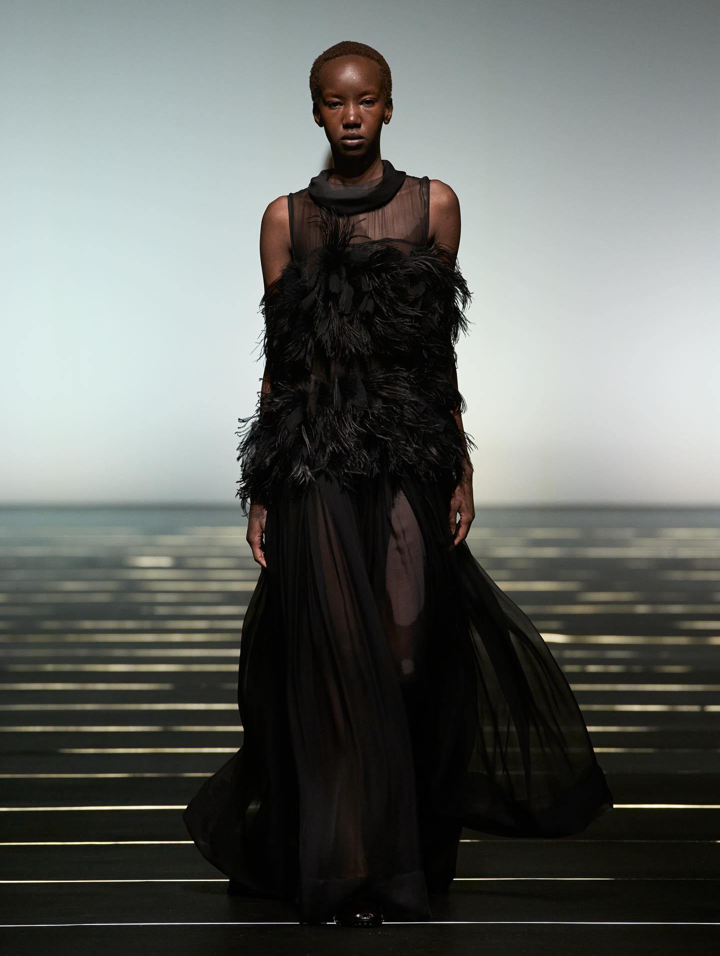 واعتمدت الدار لوحة ألوان أنيقة ضمّت الأسود والعاجي والياقوتي والباذنجاني، واستُكملت الإطلالات بأحذية تنوّعت بين البوت العالي والتصاميم المسطّحة. وزُيّنت بعض القطع بتطريزات خفيفة من الخرز ولمسات محدودة من الريش، في تجسيد لرؤية سيرافيني للمرأة التي تتألّق لنفسها أولاً، وتستمد قوتها من داخلها، لتنعكس أناقتها بنعومة راقية بعيدة عن المبالغة.