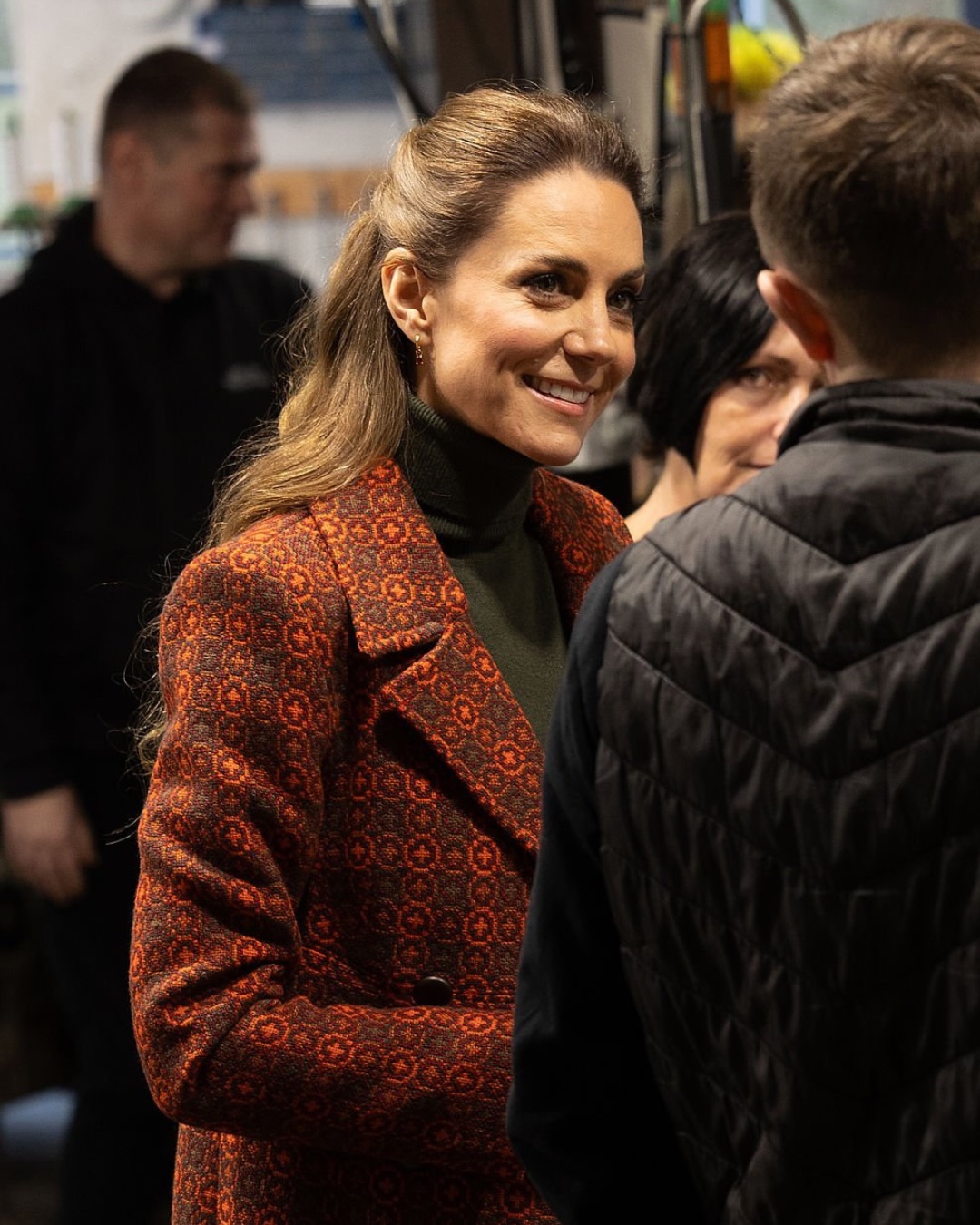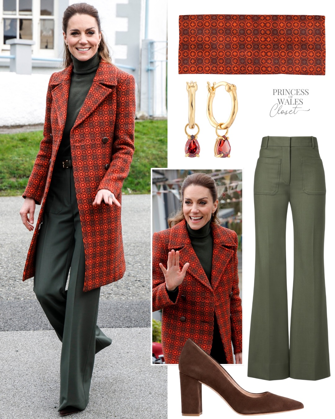 اختارت كاثرين إطلالة تنسجم تمامًا مع روح المناسبة، فارتدت معطفًا ويلزيًا عتيقًا مُفصّلًا خصيصًا لها، بدا كأنه قطعة تحكي قصة الأرض التي صُنعت فيها. ونسّقته مع بنطال Alina عالي الخصر بقصّة واسعة من فيكتوريا بيكهام بلون أخضر عميق، في توازن أنيق بين الكلاسيكية والحداثة.