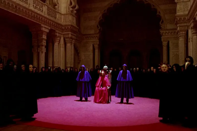 وفي مشهد آخر، يعترف عازف البيانو بأنه يعمل في حفلات خاصة معصوب العينين، قبل أن يبلغ الفيلم ذروته الرمزية في مشهد القصر، حيث الدخول بكلمة مرور، والمراقبة الهرمية، والصمت الجماعي، في طقس يبدو منظمًا ومخيفًا في آن واحد.